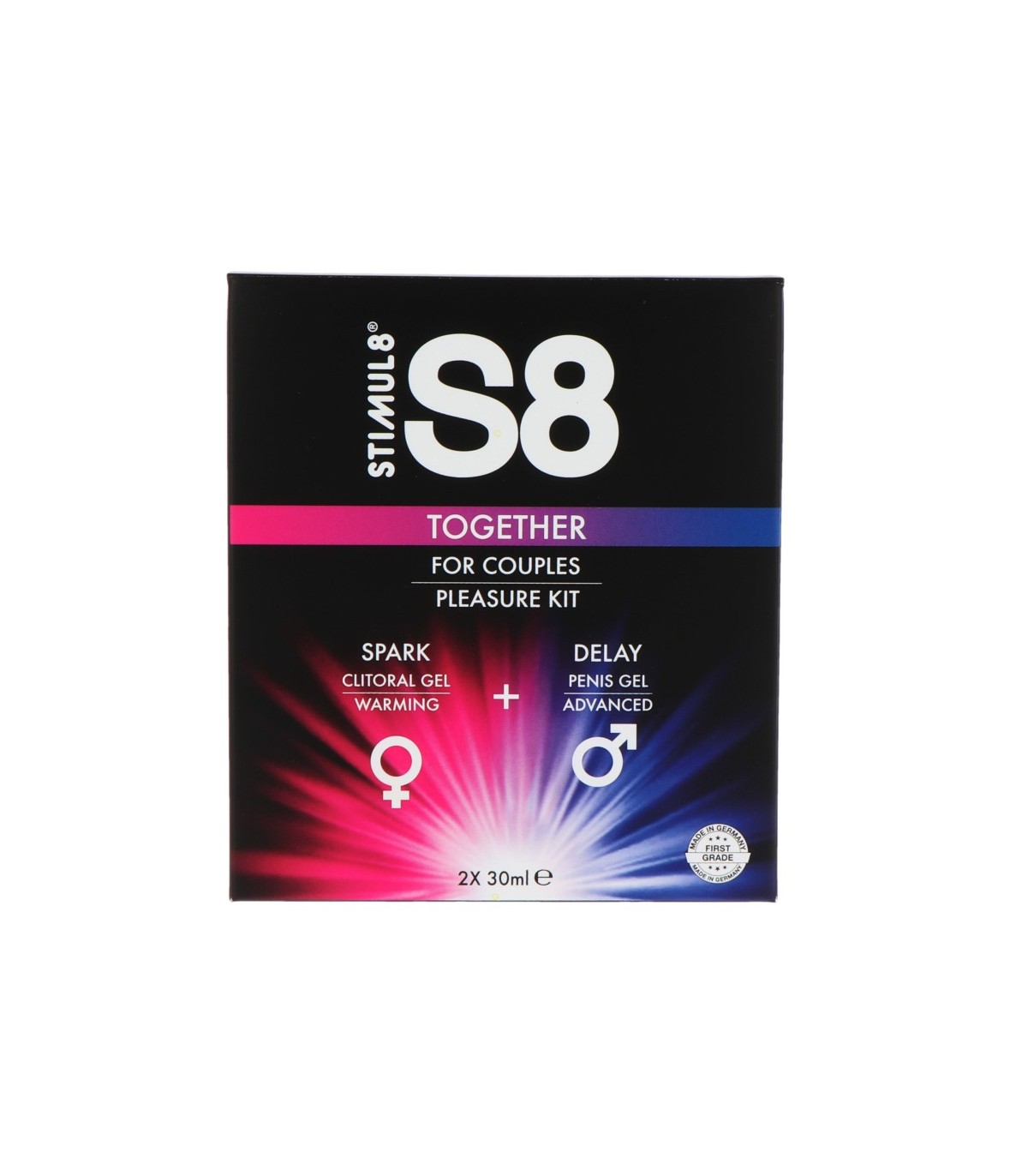 Teilen Sie den Spaß mit dem S8 Together Kit Suchen Sie nach Intimpflegeprodukten, die Paare gemeinsam genießen können? Dann werden Sie das neue S8 Together Kit lieben: Dieses Set enthält das sexy S8 Spark Clitoral Gel für Sie und das S8 Delay Gel für Ihn. Kombiniert in einer Leidenschafts-Session wird Spark die weiblichen Sinne und erogenen Zonen elektrisieren, während Delay es Ihnen ermöglicht, länger härter zu werden. Das perfekte Duo, Spark und Delay, sind eine Premium-Kombination für Paare, um ihre Wünsche gleichzeitig zu erkunden. Aus diesem Grund hat S8 die beiden Formeln in einem auffälligen Set mit großer Attraktivität als Geschenk gebündelt.