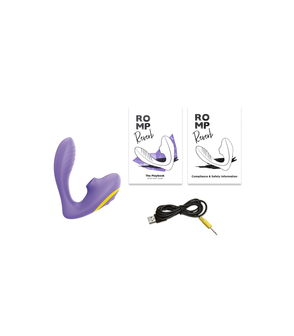 ROMP Reverb ist ein vibrierender Hase mit Pleasure Air-Technologie. Es enthält einen internen Vibrationsarm für den G-Punkt und einen externen Stimulationskopf für die Klitorisabsaugung.