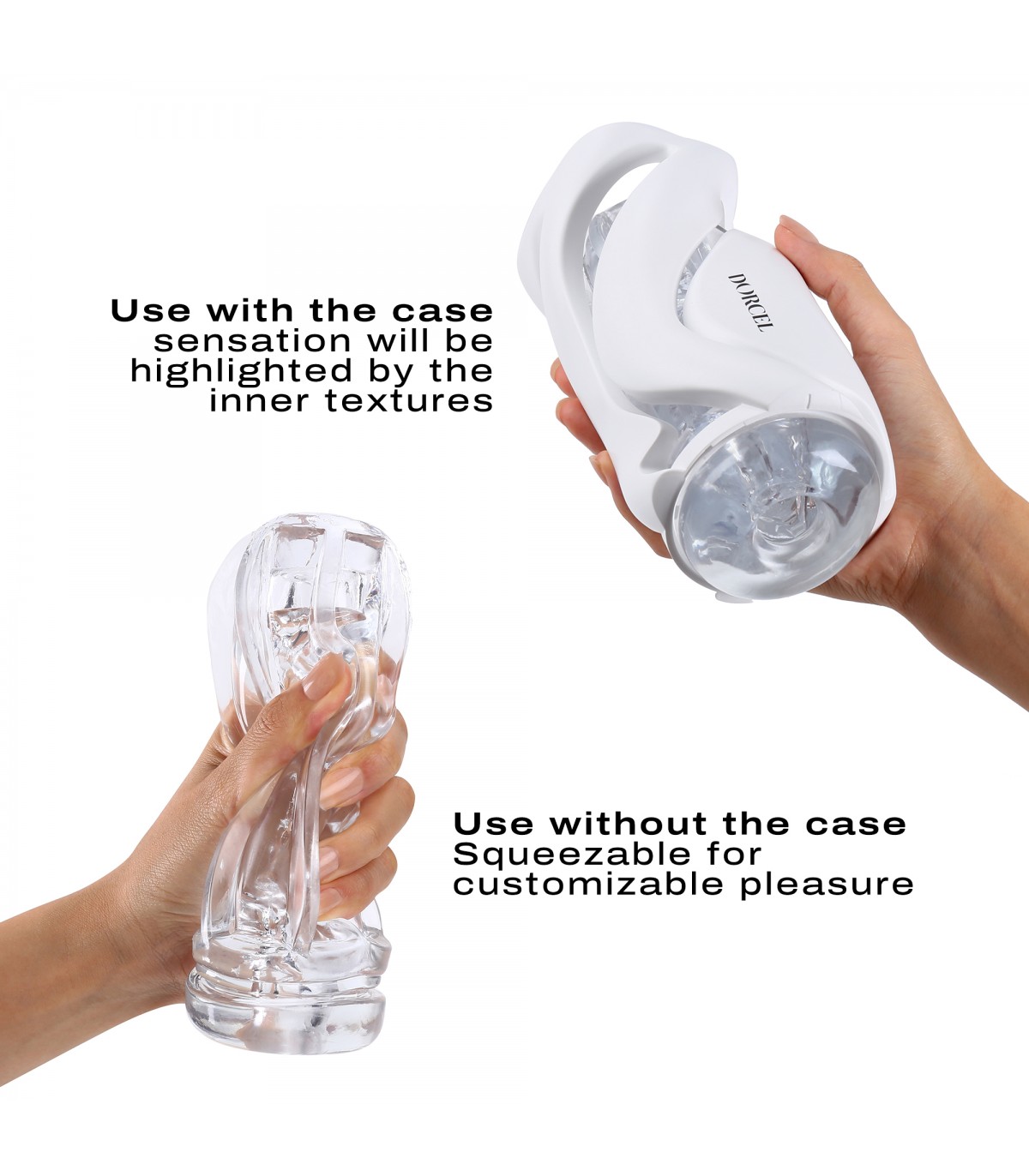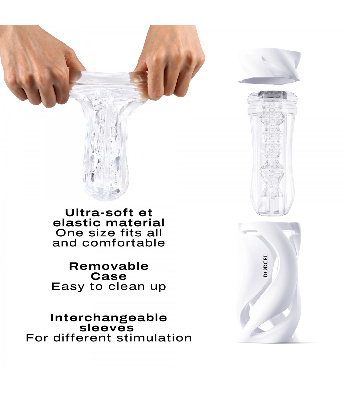 Diese 2 Hüllen sind abnehmbar und austauschbar, ebenso wie die 3 zusätzlichen Hüllen, die separat erhältlich sind. Sie können mit oder ohne Abdeckung verwendet werden. So vervielfachen Sie Ihre Masturbationserlebnisse. Etwas aufregender ist es, dass jede Hülle durchsichtig ist, sodass Sie nichts von der Show verpassen!