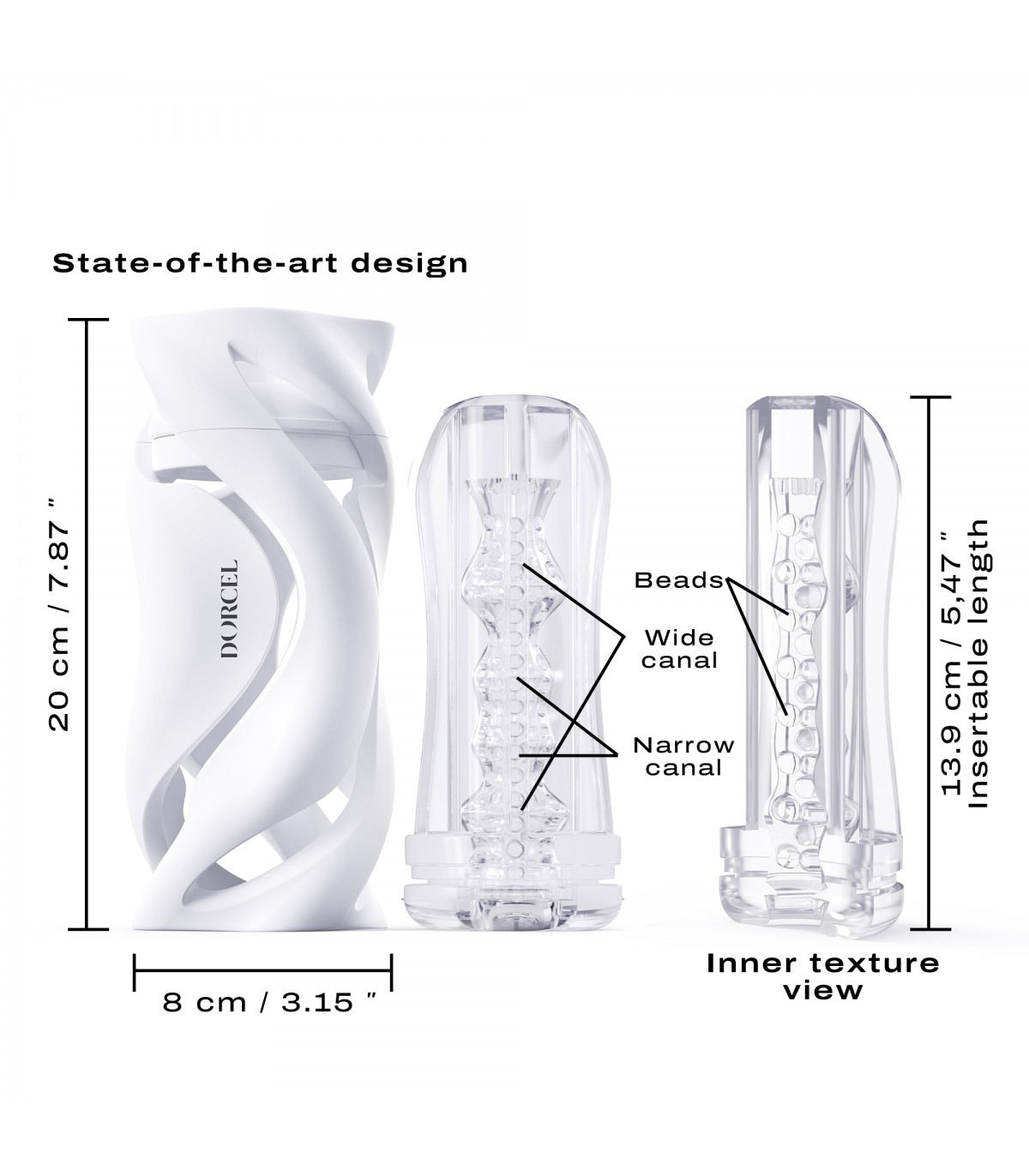 - DEEP BLOW WHITE: abwechselnder Druck dank des schmalen, dann breiten und mit Perlen verzierten Kanals dieser Hülse, die in einer weißen Box eingesetzt ist;