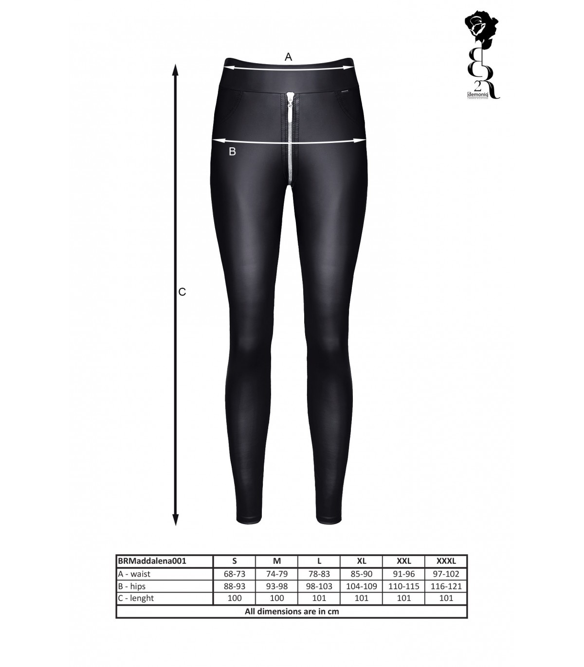 Schwarze Leggings mit etwas niedrigerer Taille und silbernem Reißverschluss vorne und hinten. Aus 360 Wetlook-Material, hautfreundlich, elastisch und in alle Richtungen dehnbar. Diese Eigenschaften machen die Hose bequem und passen sich perfekt dem Körper an, wodurch die schlanke Form der Beine hervorgehoben wird. Es fühlt sich an wie eine zweite Haut. Das Design der Gesäßlinie wurde speziell gestaltet, um ihre Form sinnlich zu betonen. Dekorativer silberner Reißverschluss, der vorne und hinten geöffnet werden kann. Anspruchsvoller Spaß und unvergessliche Momente garantiert. Die Hose hat Gürtelschlaufen.