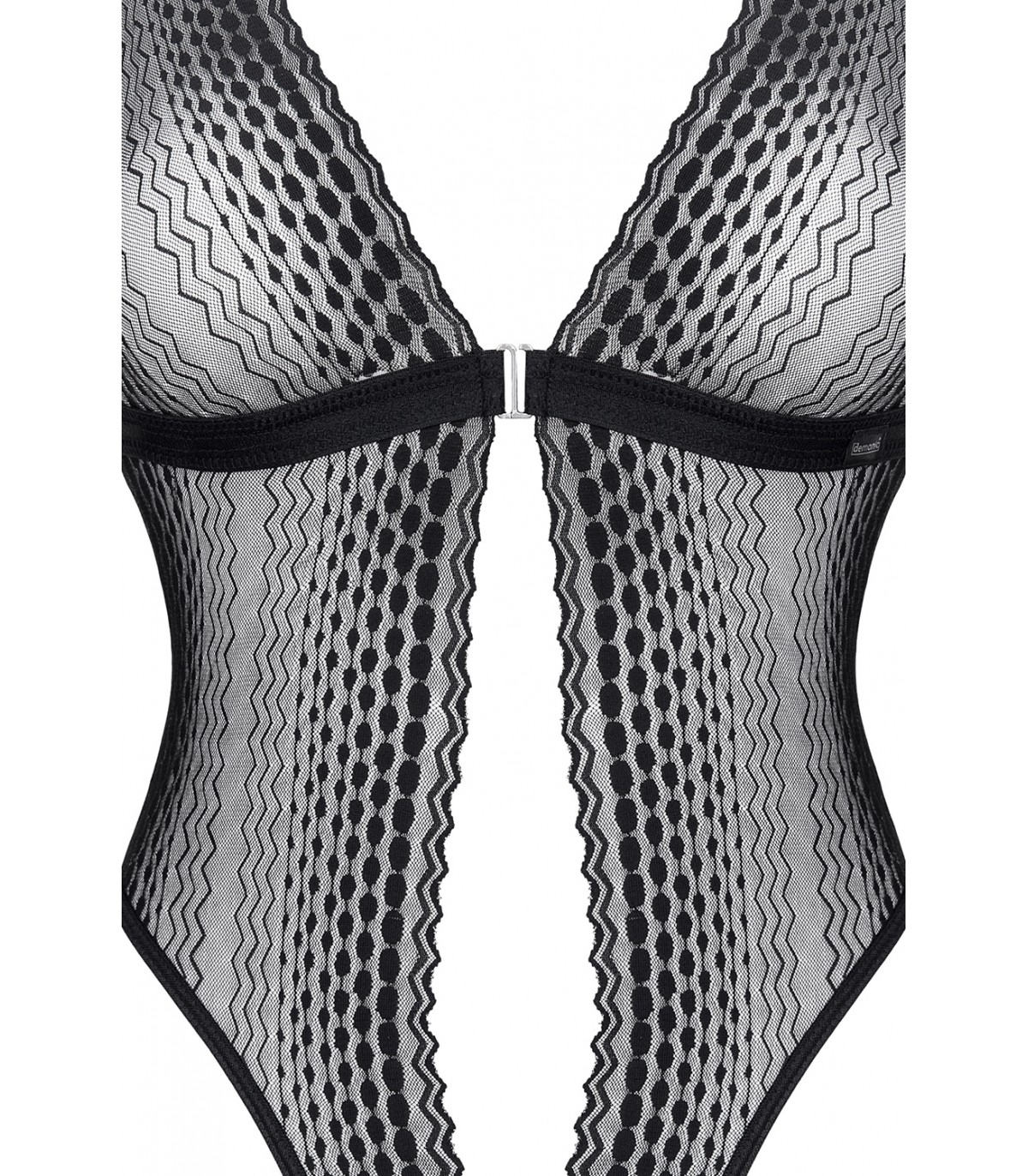Hautfreundlicher Body aus schwarzer Spitze mit vertikalen geometrischen Motiven. Markanter vertikaler Schnitt vorne. Auf der Rückseite befindet sich eine attraktive Komposition aus elastischen Bändern mit einem silbernen Metallrad und silbernen Metallreglern. Dank zahlreicher Regler lässt sich das Spiel perfekt an den Körper anpassen.