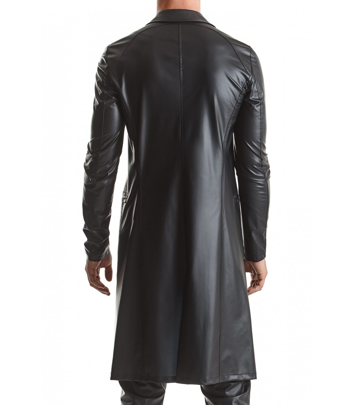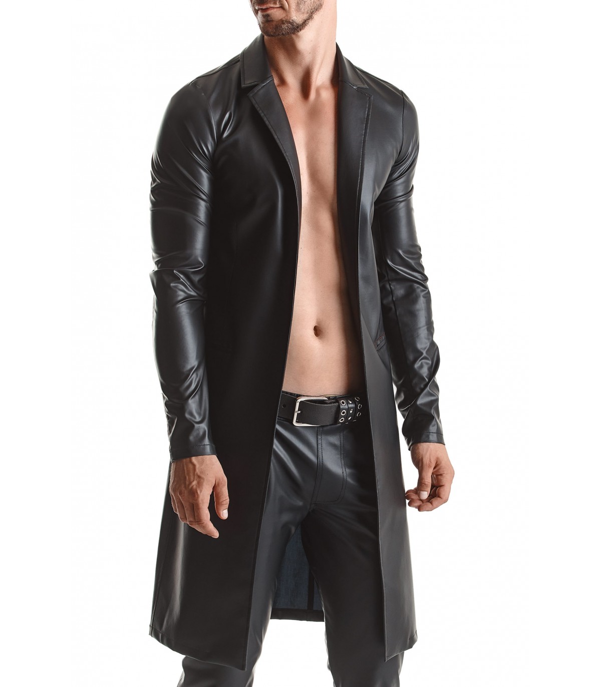 Langer Trenchcoat mit Wetlook-Effekt.