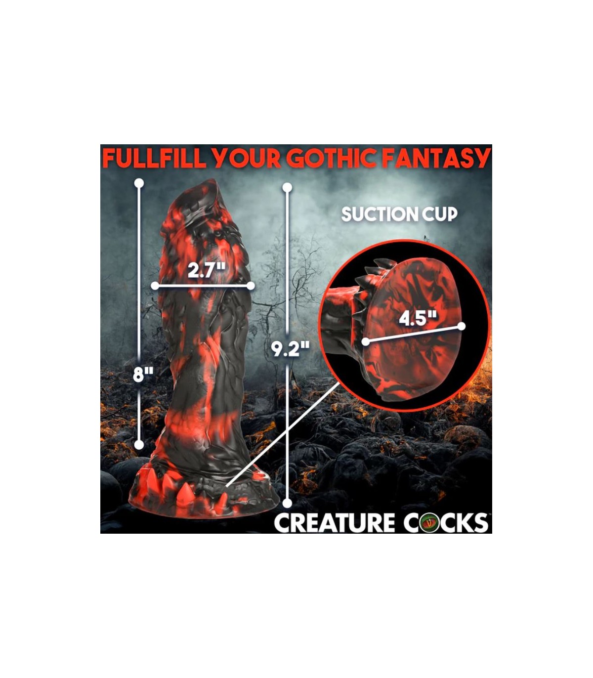Fantasy-Dildo: Dieser rot-schwarze Dildo ist dick, bedrohlich und mit Noppen, Rillen, Rillen und durchstochenen Noppen strukturiert.