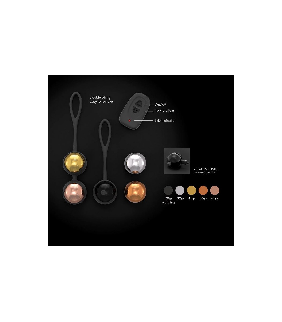 Chinesisches Balltrainingssystem mit unterschiedlichen Gewichten. Es verfügt über einen wiederaufladbaren Vibrationsball, der über die Fernbedienung gesteuert wird, um Kegel-Übungen besser durchführen zu können.