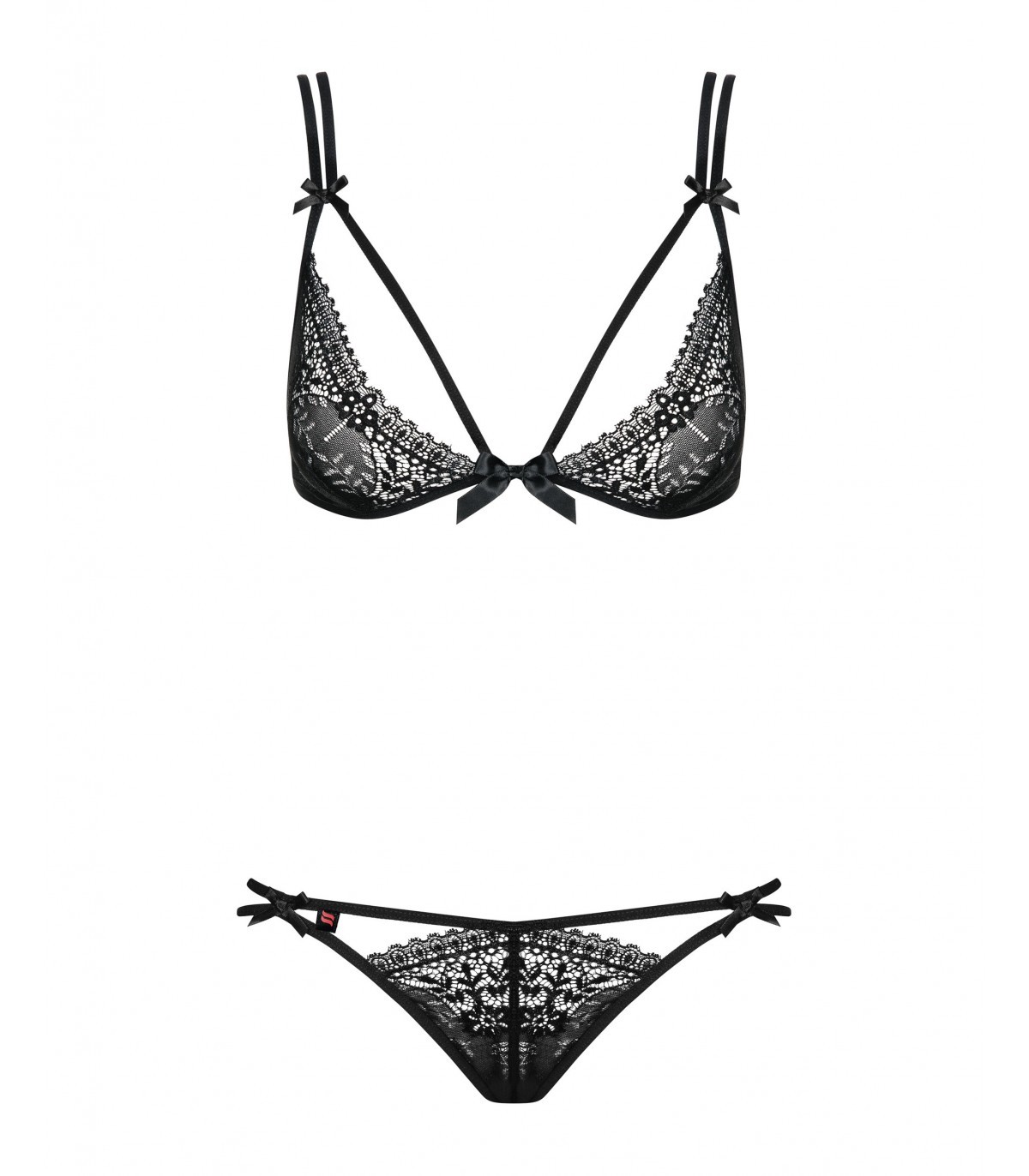 Verführerisches schwarzes SetBH aus femininer SpitzeSüßes Band, Schleife verleiht CharmeZusätzliche Träger auf der Brust betonen die KurvenTanga: doppelte Träger an der HüfteBandbänder vorne und über dem GesäßElastischer Stoff (90 % Polyamid, 10 % Elasthan).