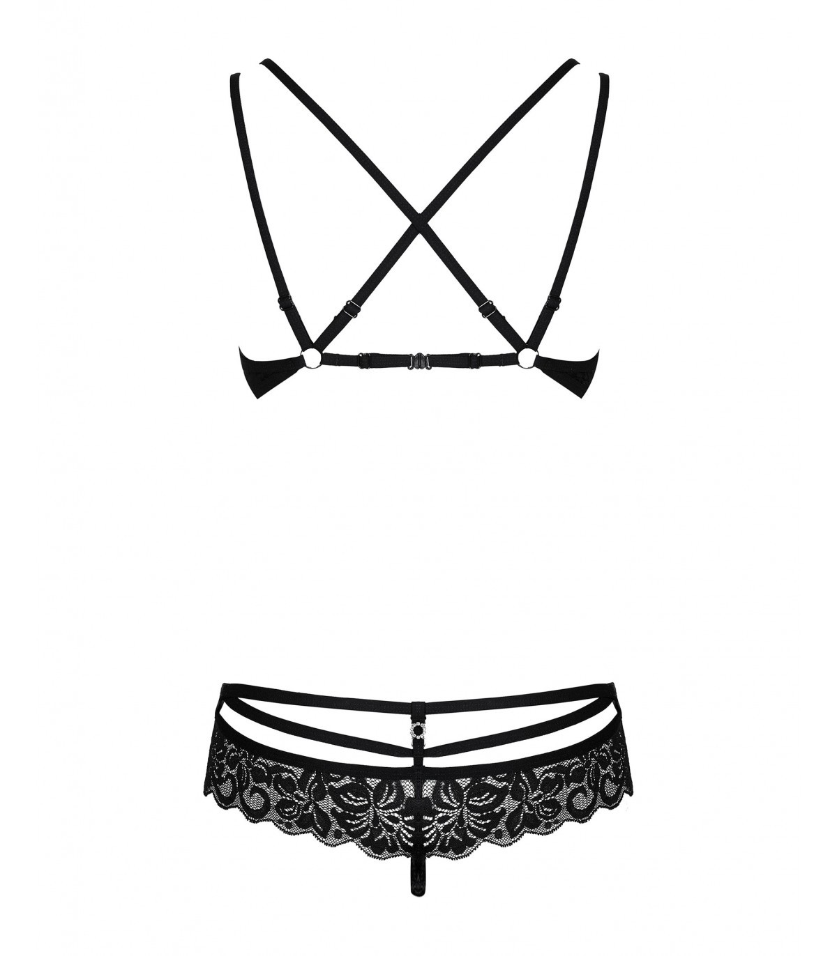 Wie wäre es mit zeitlosem Schwarz, faszinierenden Trägern und glänzenden Details? Das sind die Elemente des gewagten und äußerst sexy Sets 860-SET-1. Dieser einzigartige Effekt wird durch die Riemen gewährleistet, die sich um den gesamten Körper legen. Der Körper betont die Hüften und betont die Brust. Sie sind aufwendig im Rücken gekreuzt, sowohl im BH als auch über dem Höschen. Das Set ist mit einer zarten und sinnlichen Spitze versehen, die ihm Eleganz und Eleganz verleiht.