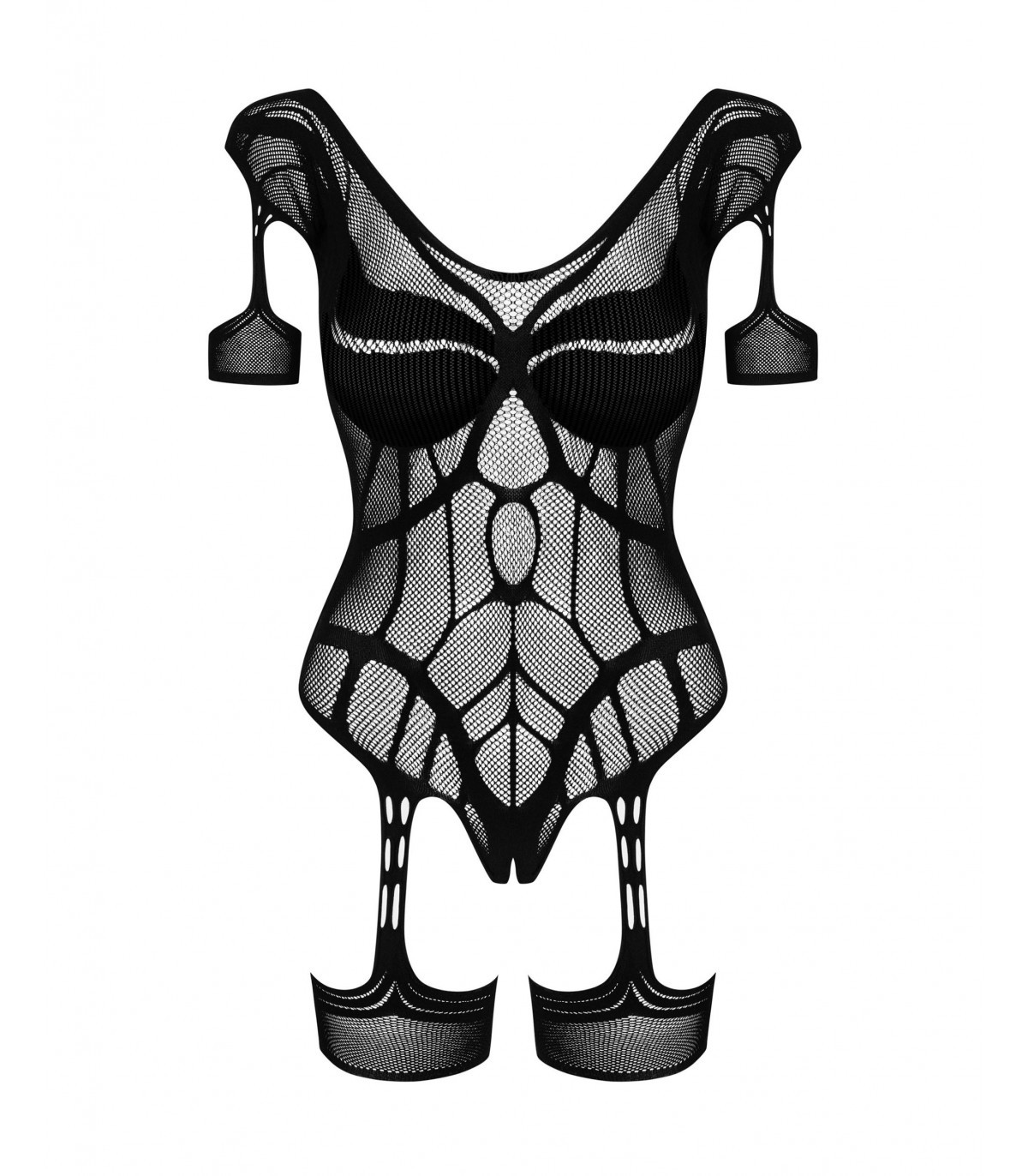 Hier haben Sie ein sehr verführerisches Design für mutige Frauen, die sich nach neuen und anregenden Empfindungen sehnen. Die Kombination aus einem offenen Bodystocking und elastischen Strapsen sorgt garantiert für ordentlich Wärme in Ihrem Schlafzimmer! Kurze Ärmel, die zu Strumpfhaltern passen, ein zartes Netz, das den Körper umhüllt, ein geometrisches Muster, das alle Aufmerksamkeit auf die Brüste lenkt, und ein tiefer, ausgeprägter Schnitt am Rücken: Was will man mehr?