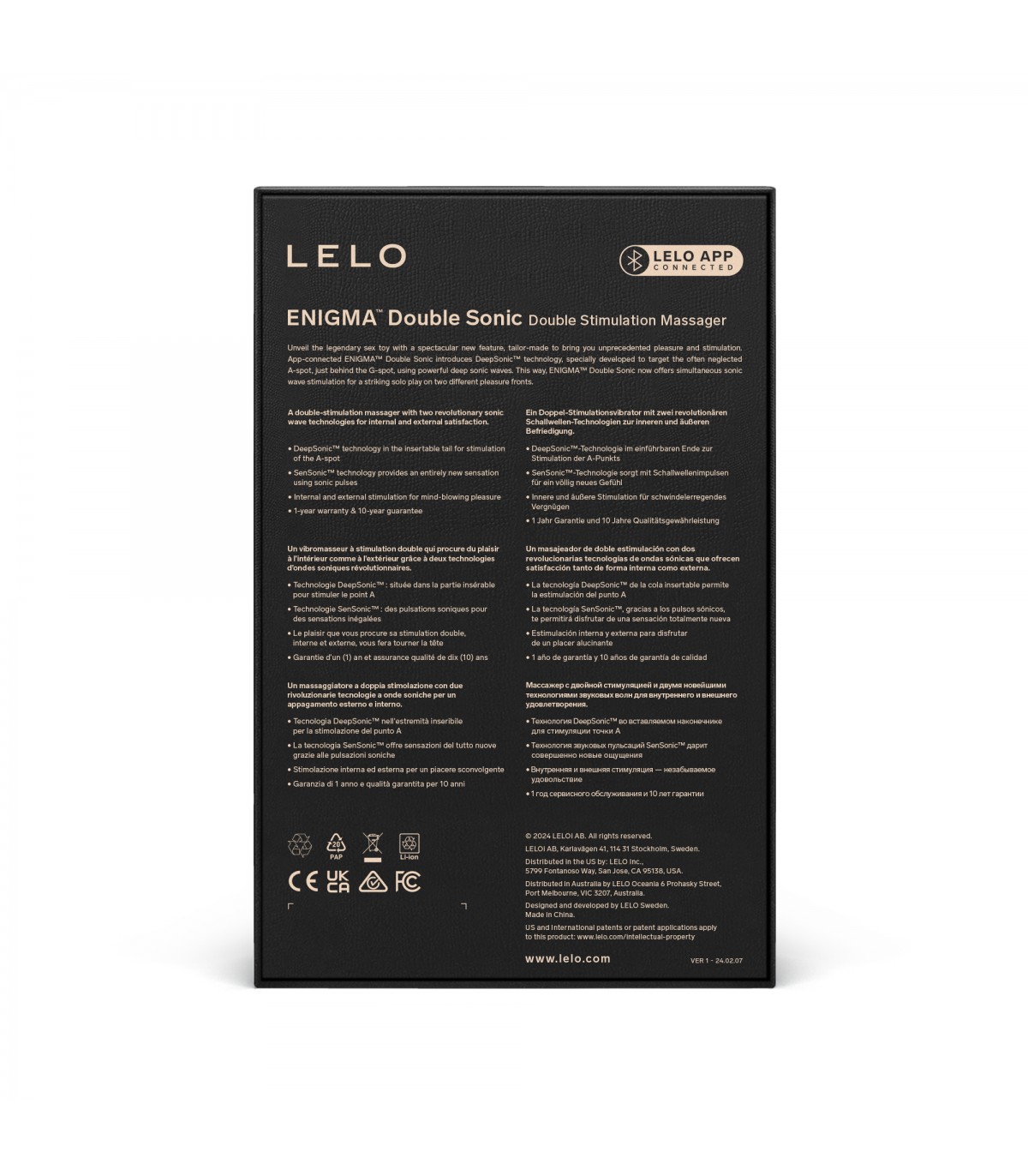 ENIGMA™ Double Sonic ist das Sexspielzeug der nächsten Generation in LELOs ENIGMA™-Reihe und präsentiert ein spektakuläres neues Gerät, das speziell für beispiellose Stimulation und Genuss entwickelt wurde. ENIGMA™ Double Sonic verfügt über die DeepSonic™-Technologie, die tiefe, intensive Schallwellen nutzt, die wir speziell entwickelt haben, um den oft vernachlässigten A-Punkt (direkt hinter dem G-Punkt) zu verwöhnen. Darüber hinaus stimuliert ENIGMA™ Double Sonic die Klitoris mit Schallwellen und vibriert gleichzeitig, um den G-Punkt zu stimulieren.