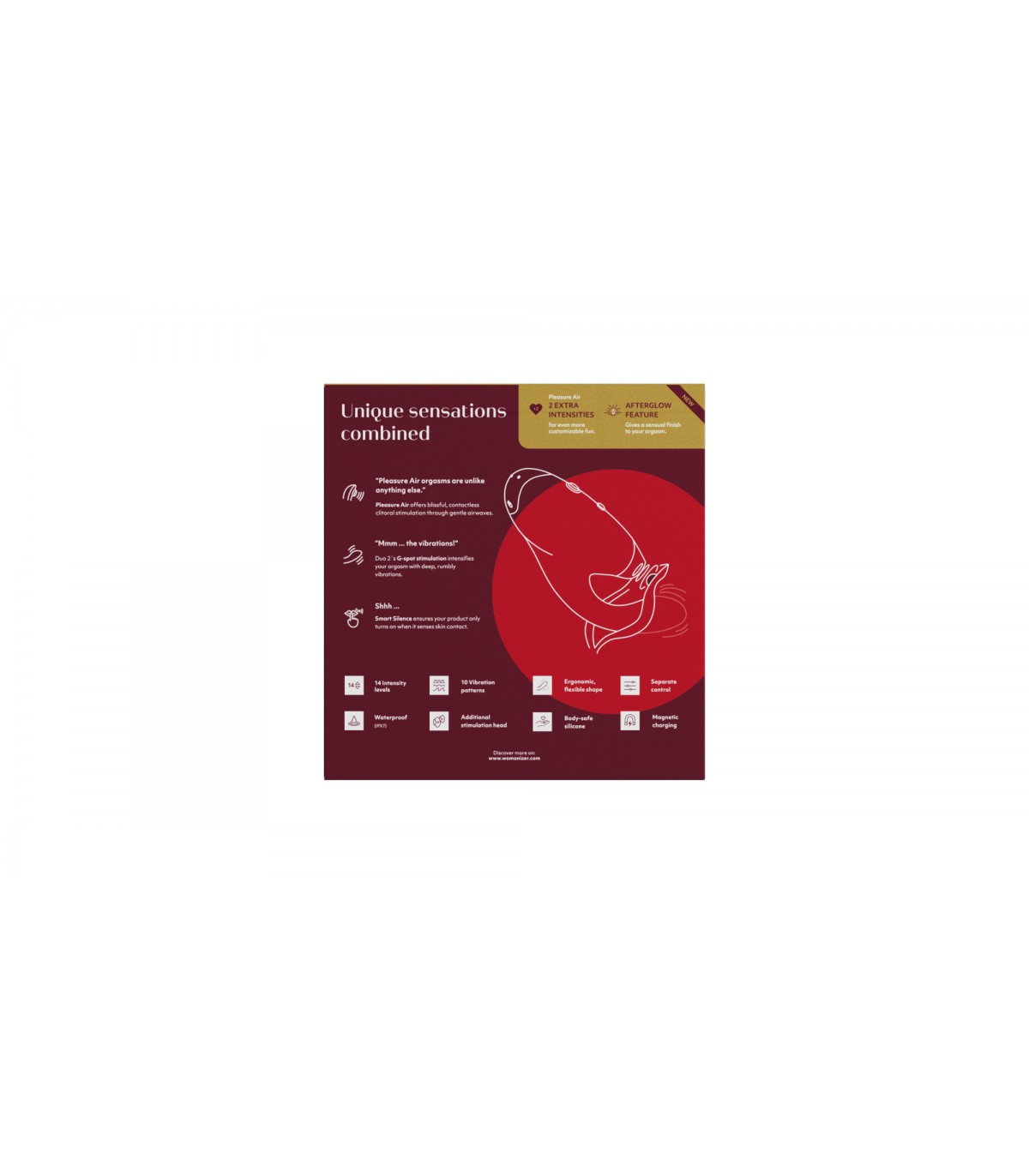 - Smart Silence: La función Smart Silence garantiza que la Pleasure Air Technology solo se activará cuando detecte contacto con la piel. Hasta ese momento el DUO 2 permanece en silencio en modo en espera para brindar una experiencia discreta y ahorrar batería.