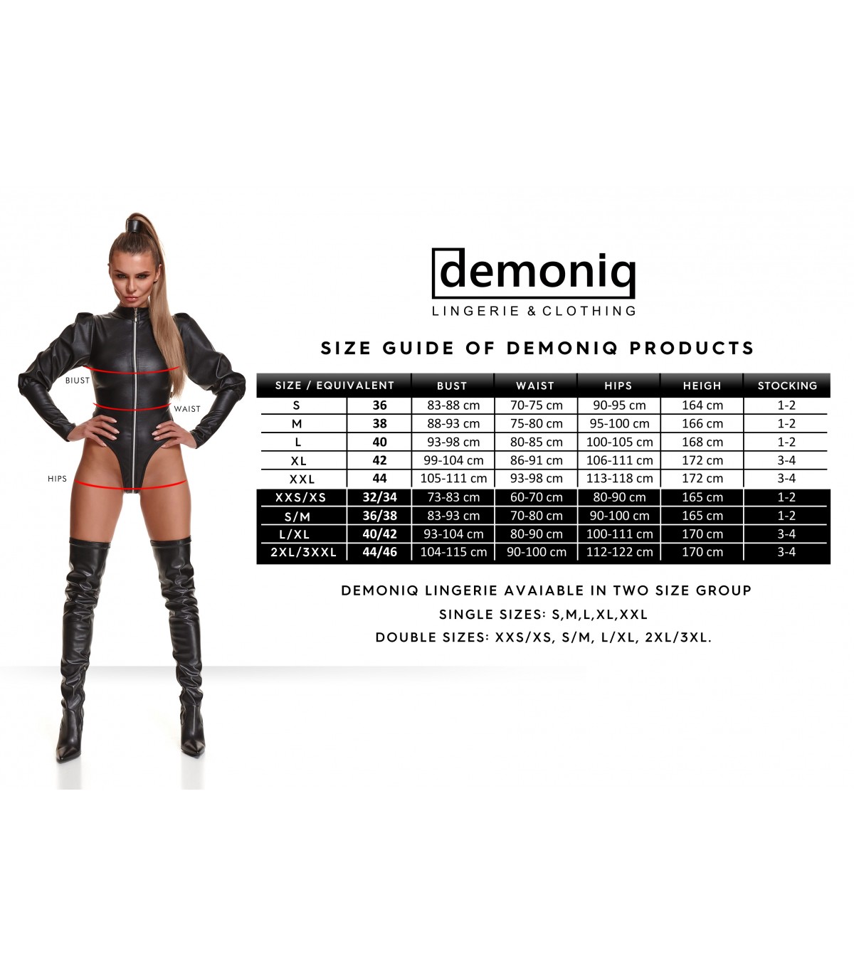 Body agradable al tacto, de encaje negro con motivos geométricos verticales. Llamativo corte vertical en la parte delantera. En la parte posterior hay una atractiva composición de bandas elásticas con una rueda de metal plateada y reguladores de metal plateado. Gracias a numerosos reguladores, el juego se puede adaptar perfectamente al cuerpo.