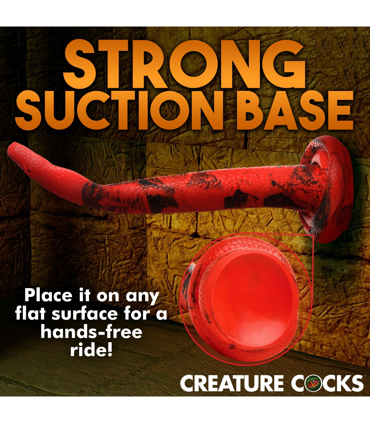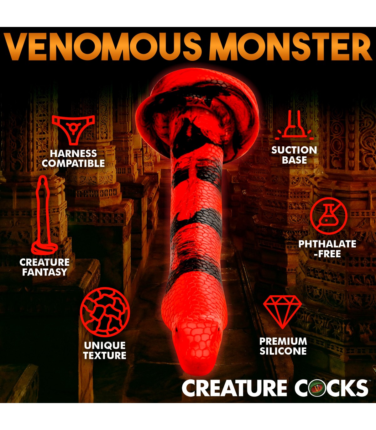 Estás listo para ser asolado? Mira lo bueno de un encanto de serpiente que eres con este Cobra de 14 pulgadas. Diseñado para desenrollarse y deslizarse profundamente dentro de su entrada trasera, está texturizado con detalles tentadores que añaden una intensa sensación a su exploración de puerta trasera. La punta de la manguera tiene la forma de cabeza de cobra. Disfrutarás de esa amplia llamarada de su cuello ancho mientras estalla dentro. La nariz recta y redonda facilita la inserción. Tiene un cuerpo rojo y negro vibrante con escamas texturadas que van hasta la base enrollada. Firme y flexible, está hecha de silicona segura para el cuerpo, premium y es libre de ftalatos. Utilícese sólo con lubricantes a base de agua para obtener los mejores resultados. La base tiene una fuerte succión-copa en ella para que puedas tener esas manos libres para guiar a la serpiente en tu caverna. La amplia base también es perfecta para combinar con un arnés de correa. Disfruta de varias maneras de jugar con esta serpiente pecaminosa. Disfruta explorando tu lado juguetón y salvaje. Prueba un poco de kink cosplay o gestiado de fantasía. Después de usarlo, lávelo con agua tibia y jabón suave, luego rocíelo con un limpiador de juguetes y deja que se seque el aire.