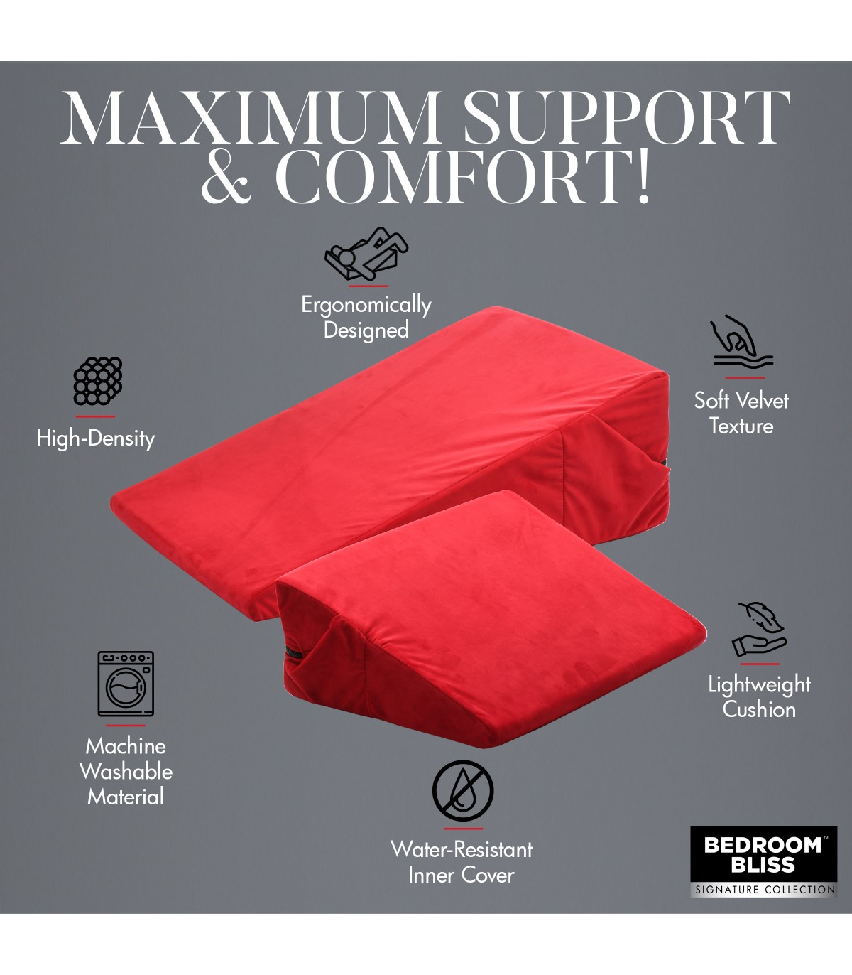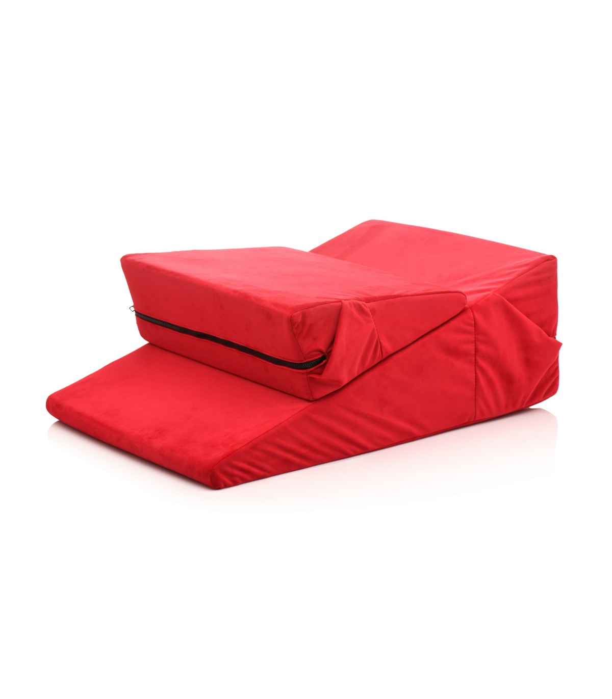 ¡Alcanzar ese punto dulce nunca ha sido tan fácil con cuñas aterciopeladas de alta densidad que puedes colocar para tu placer! Lo que parecen dos simples cuñas crean innumerables posibilidades sólo limitadas por tu creatividad. ¡Utilízalos para elevar las caderas, amortiguar las rodillas y los codos, recostarte y mejorar el sexo de nuevas maneras! Lo que antes parecía difícil o incómodo ahora puede ser fácil y orgásmico. Su suave cubierta exterior permite que su cuerpo se deslice suavemente contra ella en cada postura y la cubierta interior resistente al agua protege la espuma de la humedad y los derrames. ¡Los lados de cada almohada también tienen un bolsillo en el que puedes guardar juguetes pequeños para acceder fácilmente! Después de jugar, simplemente quita la cubierta exterior aterciopelada y la cubierta interior resistente al agua y ¡lávalas a máquina!