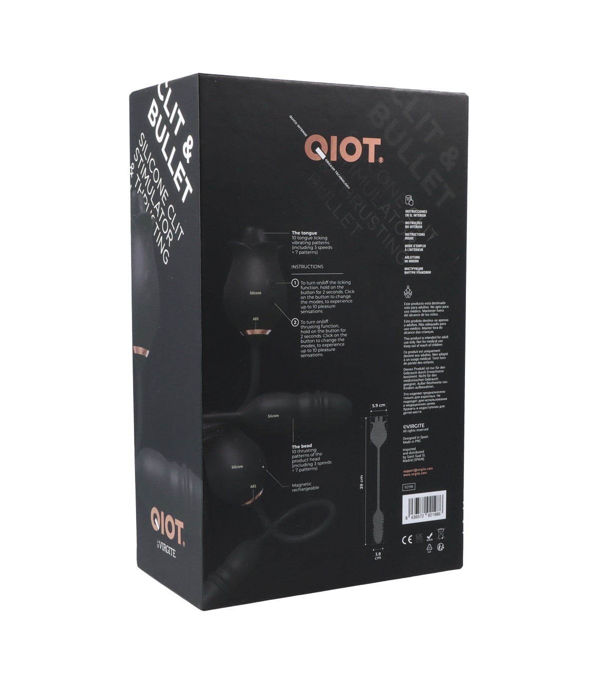 - Medidas: 39 cm de largura total / 5'9 cm de anchura estimulador clitoriano / 3'8 cm de anchura estimulador vaginal.