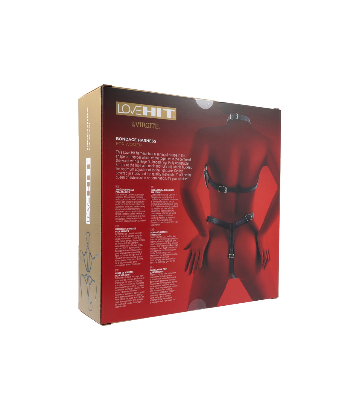 Cuenta con una serie de correas ajustables y hebillas que se unen en el centro de la cintura con un aro de gran tamaño en forma de O.