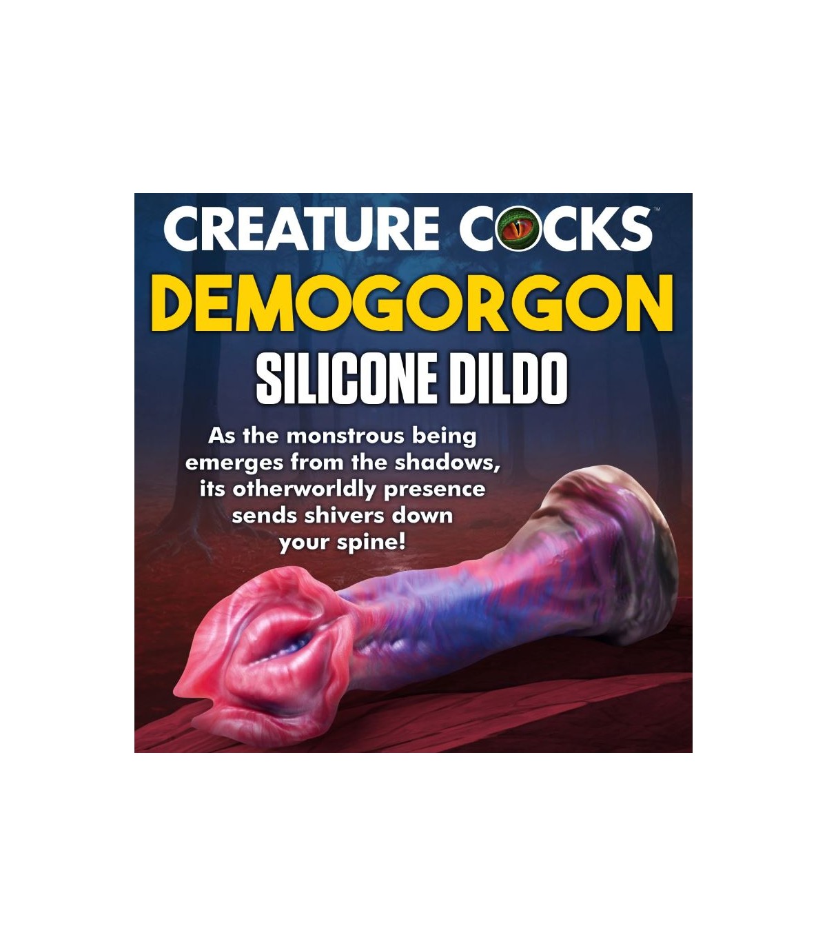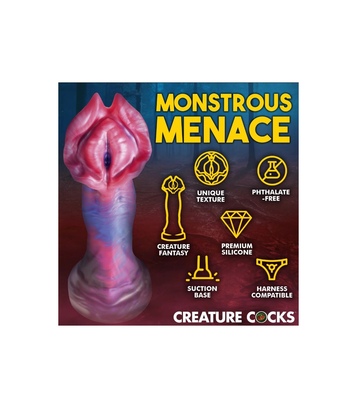 - Consolador de fantasía: este aterrador Demogorgon tiene una cabeza acampanada con labios en el frente y protuberancias en la parte posterior, eje curvo y crestas musculosas. Está coloreado de rojo, blanco, azul, negro y plateado.