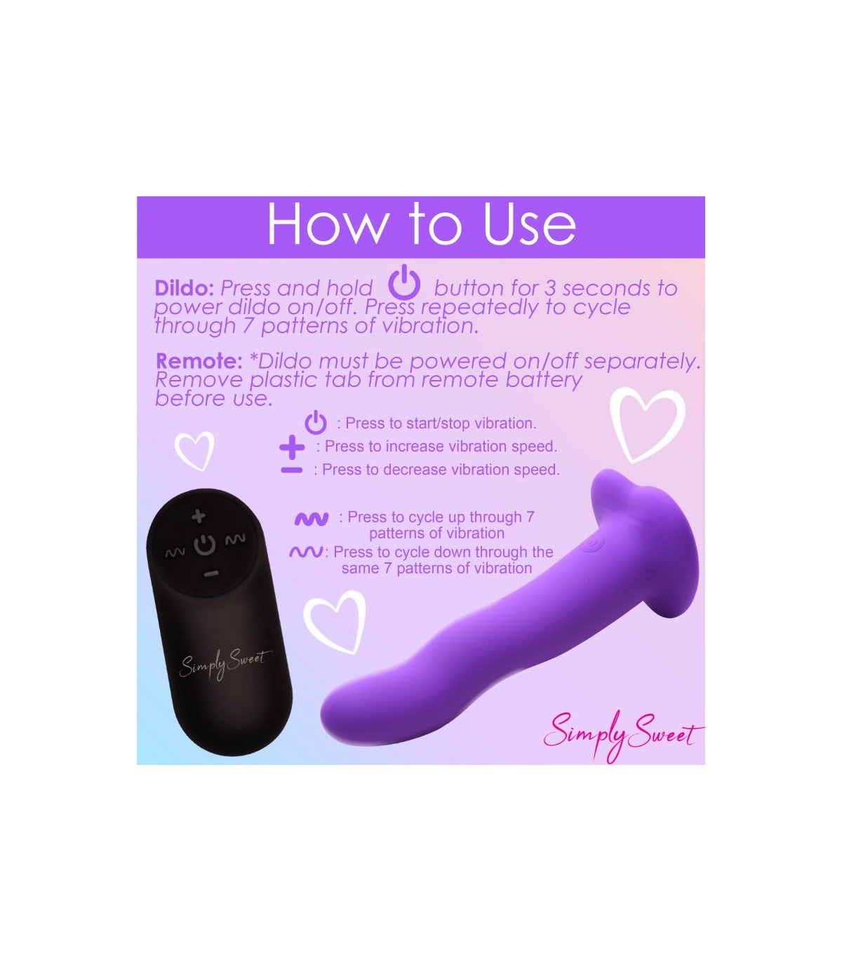 ¡Disfruta de 3 velocidades y 7 patrones que añaden un placer intensificado a tus penetrantes golpes! ¡Controle todas las configuraciones con un control remoto que funciona con baterías y que se puede usar desde una distancia de hasta 26 pies! Hecho de silicona de primera calidad, no contiene ftalatos y es seguro para el cuerpo usarlo con cualquier lubricante a base de agua. La base ancha con forma de corazón es compatible con la mayoría de los arneses con correas y tiene una ventosa para que también puedas andar con las manos libres. ¿Quieres mojarte y ponerte realmente salvaje? Clasificado como IPX7 a prueba de agua, puede soportar estar bajo el agua por hasta 30 minutos, por lo que puedes llevarlo a la bañera para jugar por períodos breves o a la ducha para sesiones largas y llenas de vapor. Después de su uso, simplemente lave con agua tibia y jabón suave, luego rocíelo con limpiador de juguetes y déjelo secar al aire. Recargue utilizando el cable USB proporcionado. Reemplace las baterías del control remoto según sea necesario.
