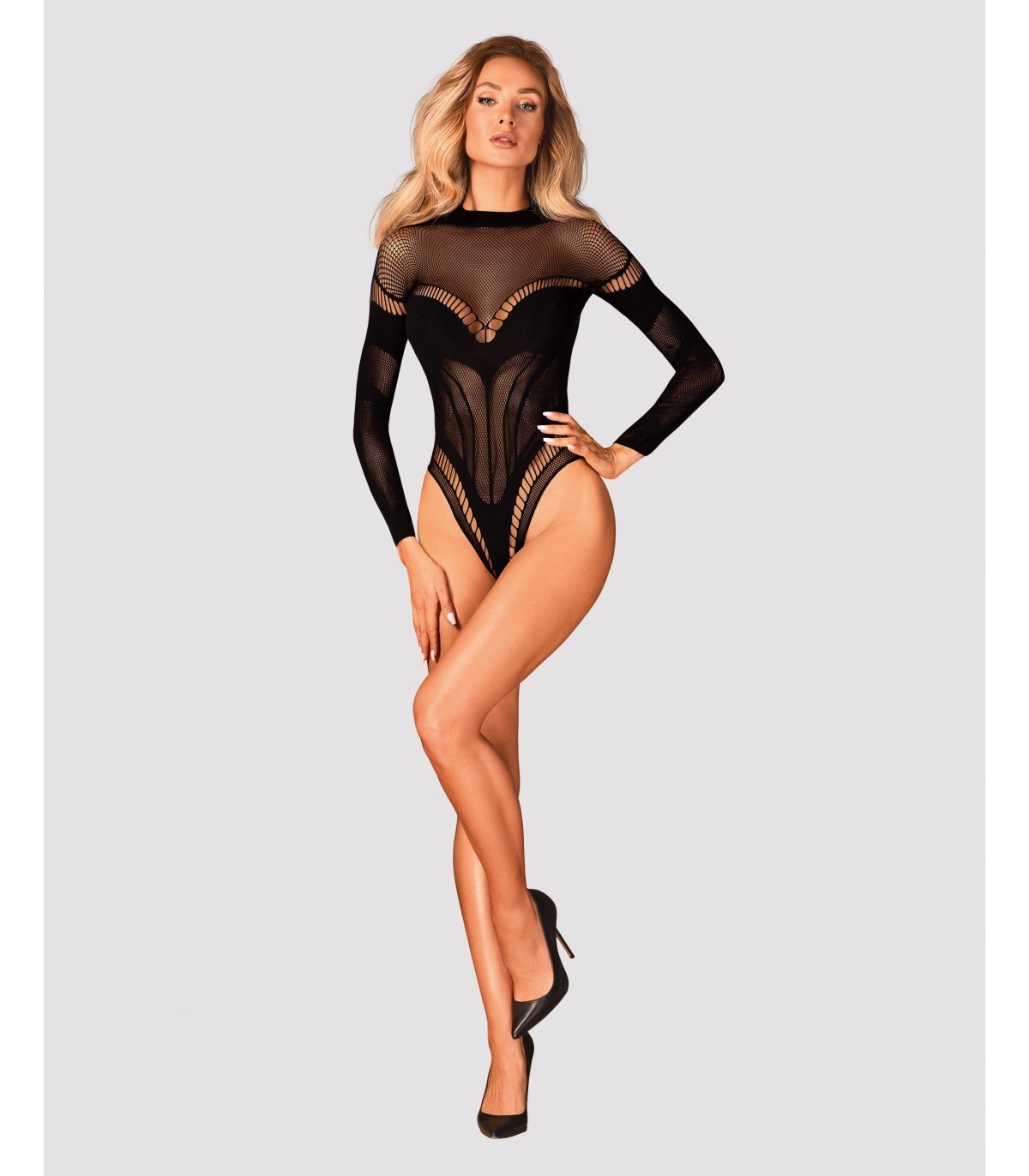 "Sexy osito de peluche hecho de una tela agradable. Los adornos geométricos caen perfectamente sobre el cuerpo, enfatizando sus ventajas. El corte intrigante en la espalda llama la atención y agrega atractivo sexual. La entrepierna abierta es un elemento picante que seguramente agregará un ambiente cálido a la noche. .