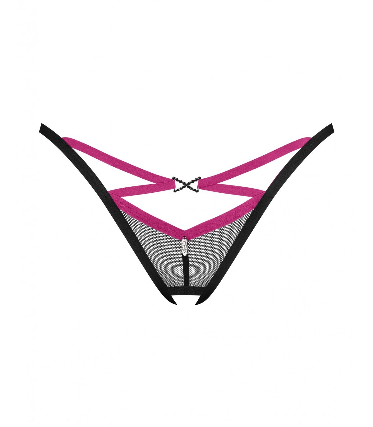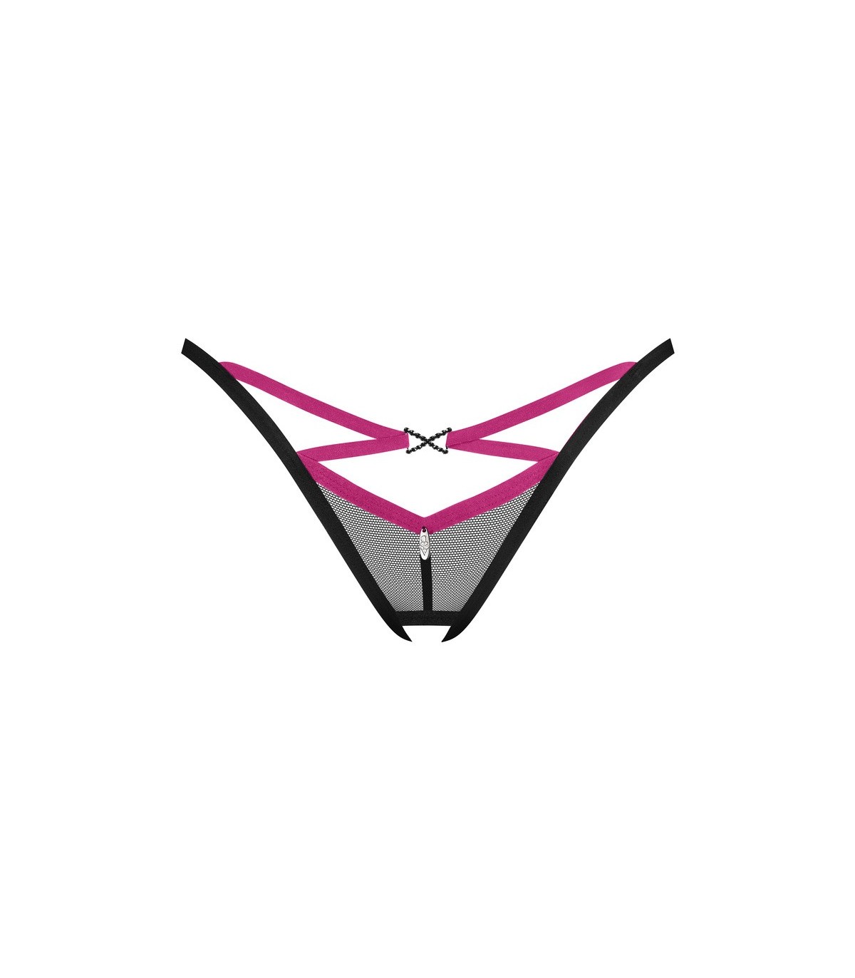 ¡Un diseño minimalista que proporciona máximas emociones! El tanga clásico acentuará perfectamente la forma de tus nalgas. La entrepierna abierta es garantía de momentos sensuales. La delicada tela negra se adaptará delicadamente al cuerpo y resaltará su belleza. Las correas moradas y el colgante plateado adornado con circonitas negras aportan diversión adicional. ¡Cumple tus fantasías con la lencería Novenes y siéntete sensual en cualquier situación!