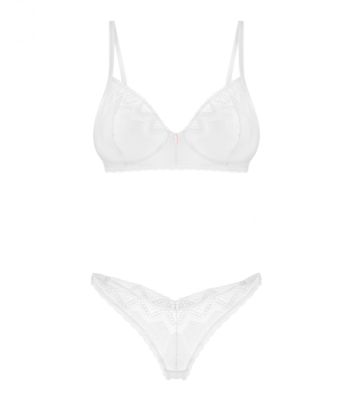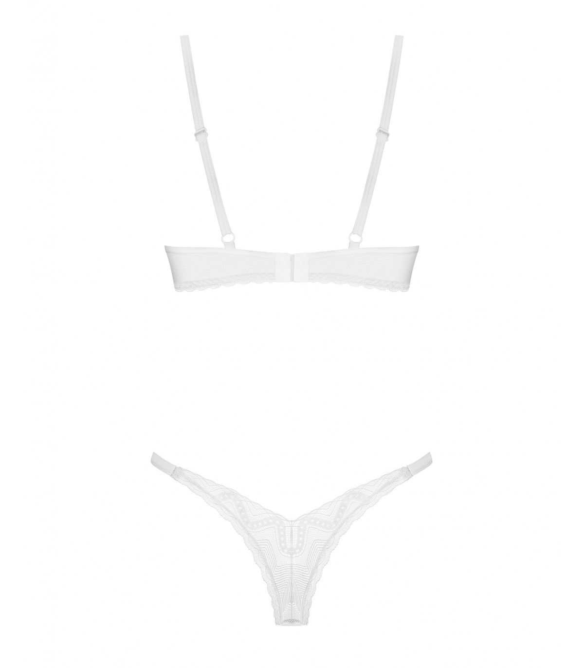 ¿Puede el minimalismo encender la pasión? ¡Este conjunto blanco de Alissium responde con un rotundo sí! El estilo de lencería tradicional se combina con un intrigante motivo geométrico que despierta imaginación y encanto. El sujetador y el tanga, que esculpen tus curvas con delicadeza, seguramente dejarán una impresión duradera, no sólo en ti... ¡sino en cualquiera que tenga la suerte de contemplarlo! Da rienda suelta a tus fantasías mientras descubres el potencial sensual de este cautivador conjunto.