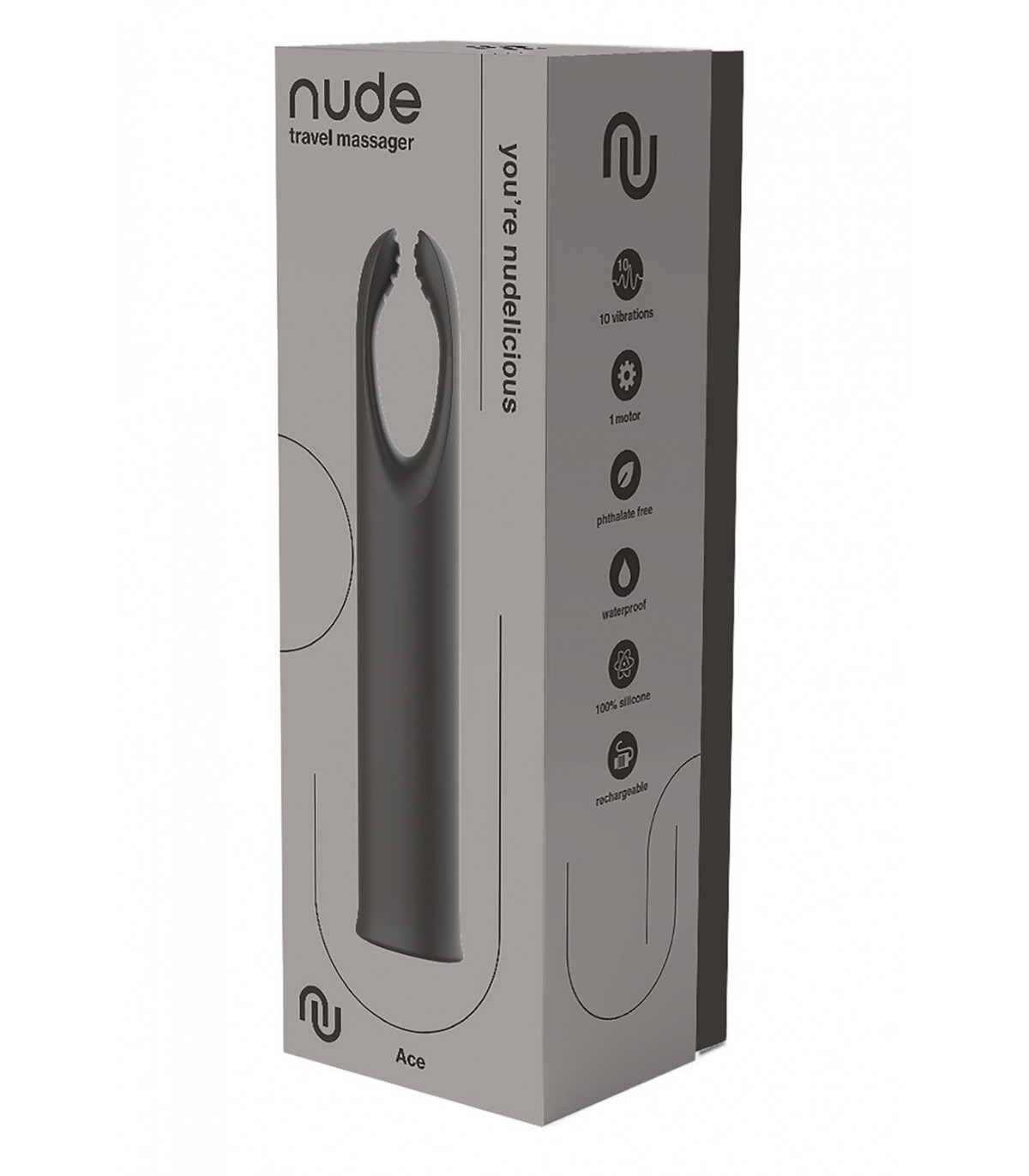 Este masajeador de tamaño de viaje de Nude tiene operación con un solo botón para recorrer las 10 vibraciones fuertes. Tiene 7 ritmos y 3 velocidades. Las alas suaves y flexibles hacen que este masajeador sea perfecto para principiantes y para cualquiera a quien le guste la estimulación sutil y tentadora. El Nude Massager Ace está hecho de suave silicona y ABS, libre de ftalatos y seguro para el cuerpo. Ace tiene una clasificación IPX6 de resistencia al agua. Para cargar después de su uso, el vibrador tiene un orificio de carga impermeable. Se incluye un cable con clavija USB. Después de una carga completa, tu vibración Nude estará lista para 90 minutos de deleite nudelico.