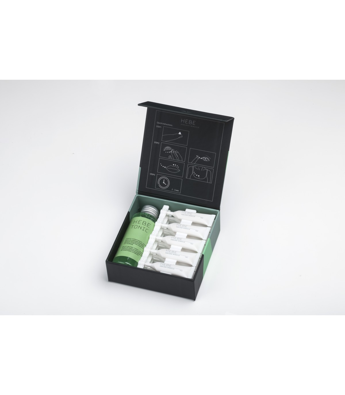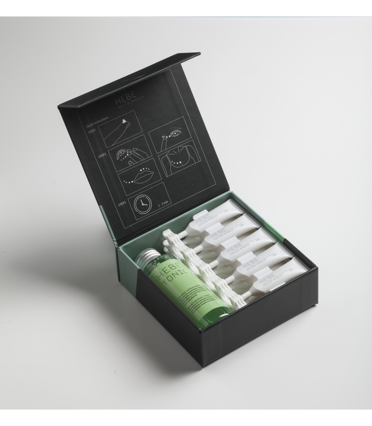 Este pack de compone de las 20 monodosis de la crema antiedad Hebe, ideal para hombres y mujeres, que lleva a cabo sobre la piel un efecto lifting inmediato, reduciendo de manera visible las arrugas y líneas de expresión.Aplicada en el contorno de ojos ayuda a disminuir bolsas y ojeras.De manera instantánea mejora el aspecto de la piel y reduce las arrugas, un efecto pasajero que dura entre 6 y 9 horas.Es perfecta para usar en un evento u ocasión especial.Este pack viene con un tónico especialmente elaborado para retirar el producto, y que además gracias a su formulación con Aloe Vera hidrata la piel y la mantiene luminosa, tersa y suave.También contiene vitamina C que tiene propiedades antioxidantes. Consejo técnico Se puede aplicar maquillaje de forma posterior.