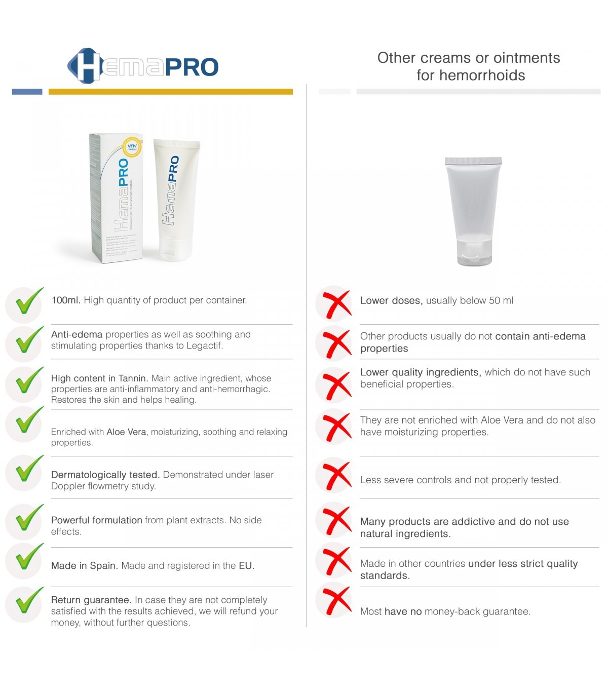 Crema para irritaciones de la piel de la zona del perineo. Hemapro Cream es una nueva crema para hemorroides elaborada a partir de un exclusivo compuesto vegetal de vara de oro, limón y ruscus que ayuda a calmar la irritación, reduce la hinchazón de la piel del área del perineo y mejora la circulación sanguínea de la piel en al menos un 31%.
