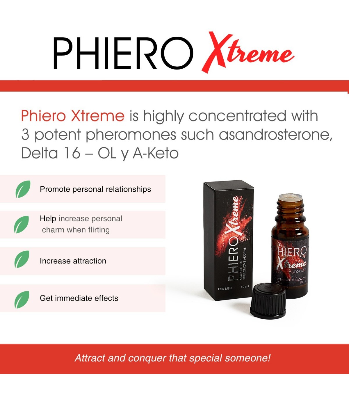 Phiero Xtreme es un concentrado de feromonas con un potente efecto de atracción. Está elaborado por 3 fuertes feromonas, Androstenona, Delta 16-OL y A-Keto, con una concentración del 20 %, en feromonas, por lo que resulta el producto más completo y efectivo. No contiene aromas añadidos por lo que se puede aplicar y pulverizar después la colonia habitual para favorecer el atractivo masculino además de una mayor confianza y autoestima en el hombre. Phiero Xtreme lleva la mayor cantidad de feromonas de toda la gama Phiero, con una concentración del 20 %. La mayoría de los perfumes con feromonas ofrecen una concentración entre el 1 % y el 5 %, por lo que Phiero Xtreme es uno de los productos con feromonas más completos e innovadores. Phiero Xtreme actúa en base a los instintos más primarios del ser humano, por lo que no modifica la conducta, sino que amplía el poder de atracción de forma natural. Sus feromonas actúan sobre los instintos primarios de las demás personas, ya que son detectadas de forma natural a través del sentido del olfato con el órgano vomeronasal, produciendo una sensación de comodidad que permitirá mantener una relación personal más cercana, favoreciendo así la conquista. Contiene un 20% de concentración de feromonas, por lo que es la mayor de toda la gama Phiero. Las 3 potentes feromonas son Androsterona, Delta 16 OL y A-Keto. Sin olor, no contiene aromas añadidos y solo ofrece el olor intenso de las propias feromonas, para potenciar la capacidad de atracción del hombre. Se puede aplicar directamente sobre la piel y pulverizar después la colonia habitual o perfume favorito para favorecer el atractivo masculino. Actúa a los 30 minutos de aplicarlo y su efecto es duradero en el tiempo. Uso: vía tópica. Formato: gotero de 10 ml - Aplicar solo (2 gotas en cuello y muñecas) o mezclar con perfume o colonia si se desea (20 gotas por 10 ml de perfume) y pulverizar entre 3 y 4 pulsaciones en cuello, orejas y muñecas.