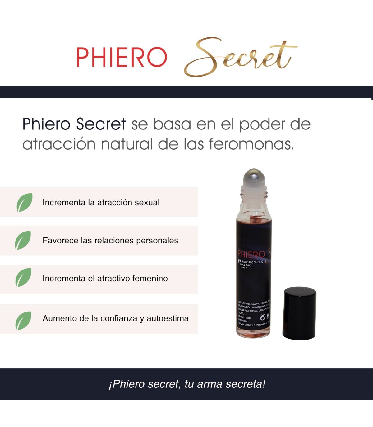 Phiero Secret es una combinación de sustancias inodoras que actúan como hormonas femeninas, aumentando la atracción. La fórmula de Phiero Secret imita las feromonas femeninas, en concreto las copulinas, por lo que los hombres se sentirán más atraídos hacia las mujeres que presentan una mayor cantidad de esta hormona. Es inoloro, por lo que puede combinarse con cualquier tipo de fragancia. Podrás llevar el perfume con feromonas Phiero Secret a cualquier lugar para atraer al género opuesto o a quien desees. Phiero Secret está indicado para: Incrementa la atracción sexual Favorece las relaciones personales Incrementa el atractivo femenino Aumento de la confianza y autoestima Se combina con cualquier perfume Efecto inmediato Las feromonas son inodoras y conscientemente indetectables para el olfato humano, pero nuestro sentido del olfato puede percibir las feromonas secretadas, sin ser conocedores de ello.