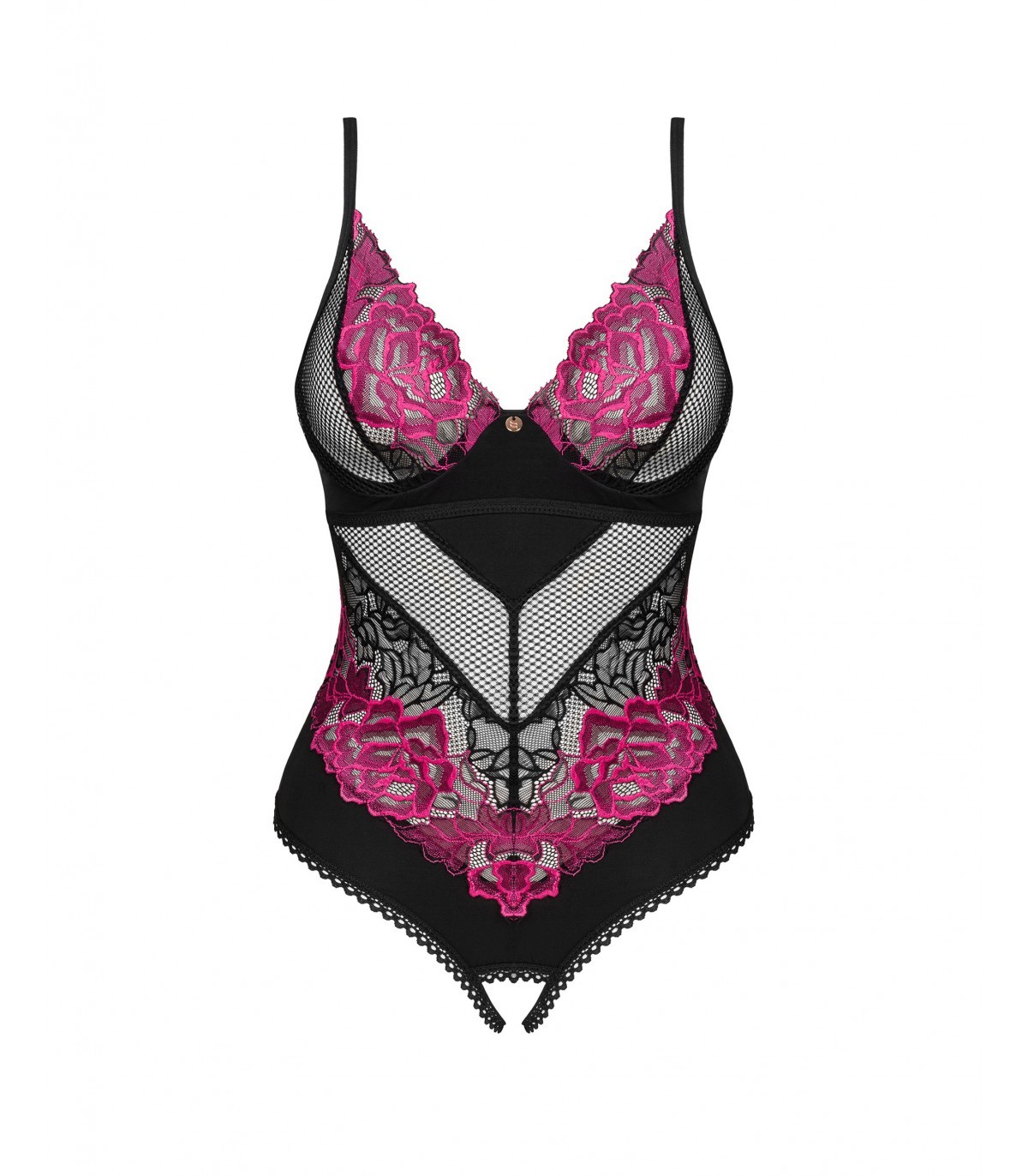 Prepárate para una velada romántica a la luz de las velas y enciende la llama de la pasión en el corazón de tu ser querido. El peluche negro Rosenty con una entrepierna seductoramente abierta te ayudará y al mismo tiempo te presentará los secretos del placer irresistible. Deja que el suave material envuelva tu cuerpo con comodidad y realce tu figura, y los detalles sutiles harán imposible que nadie deje de mirarte.