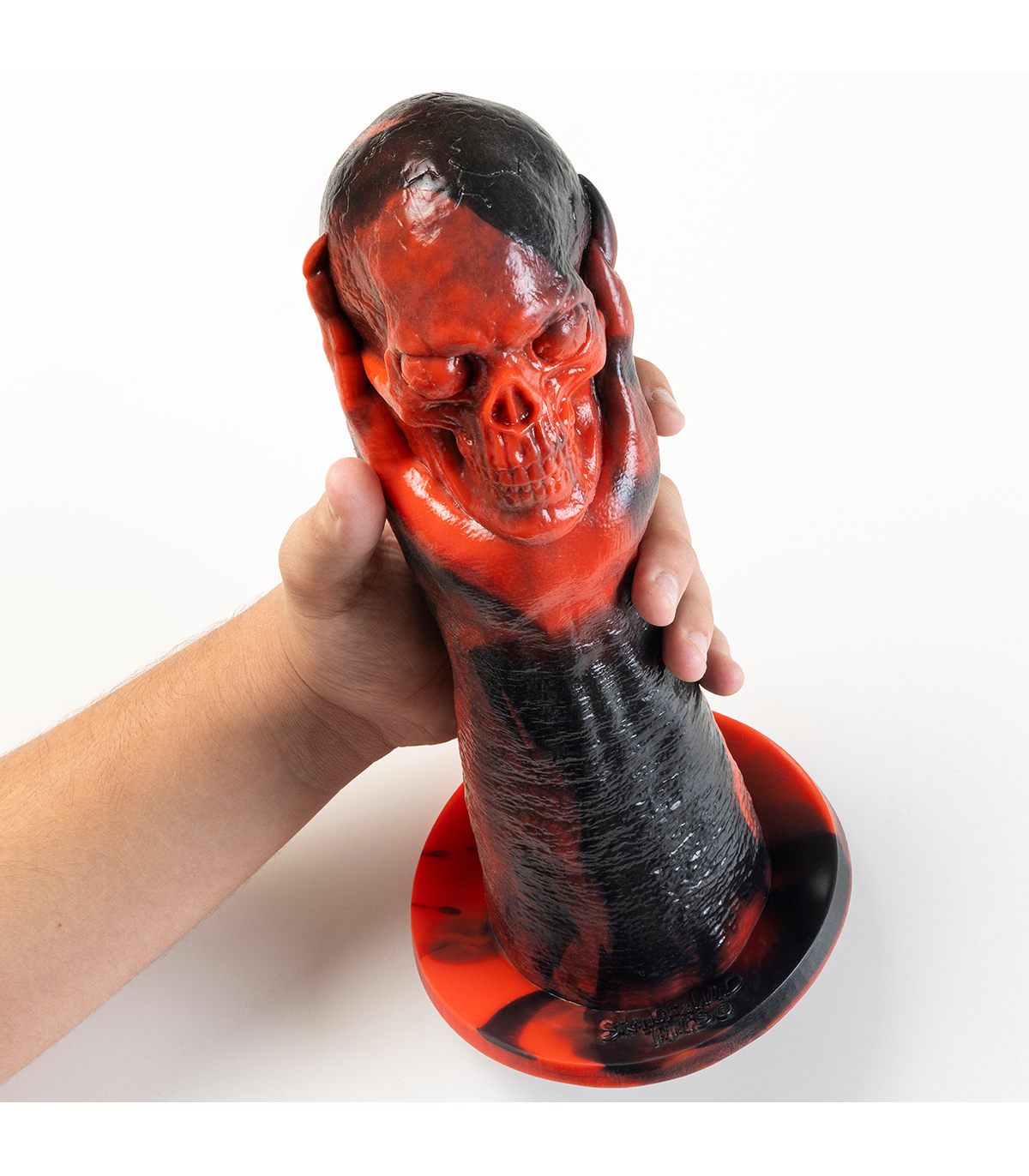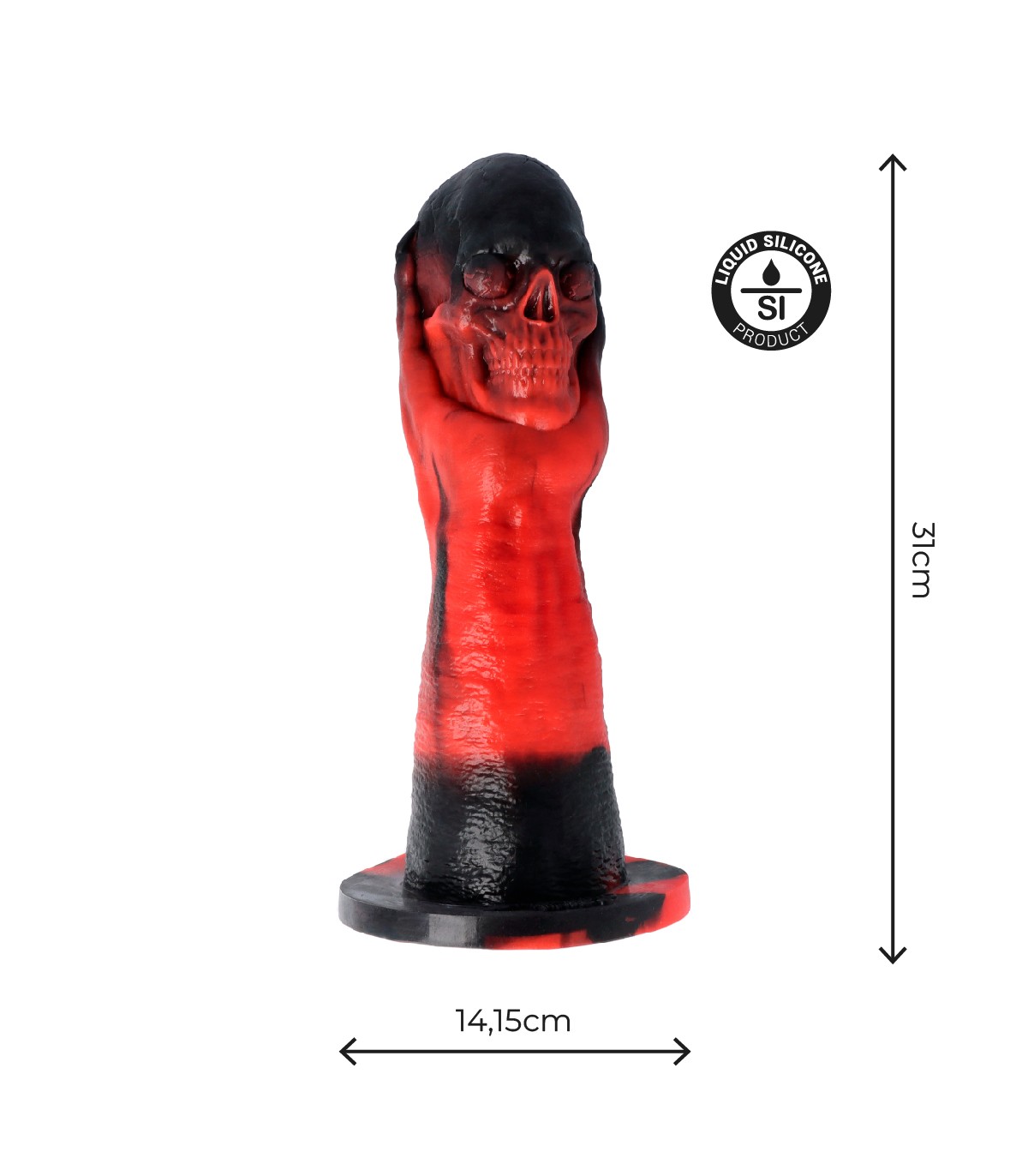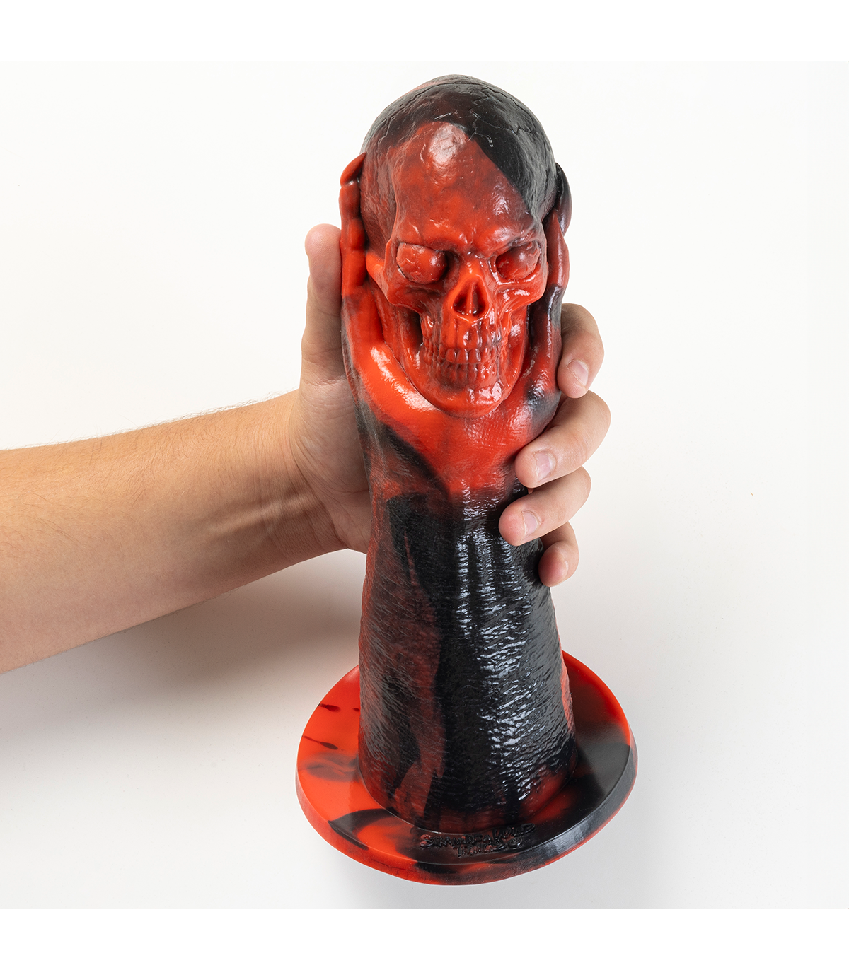 Este dildo tiene forma redondeada en el extremo simulando una calavera sujetada por un brazo.