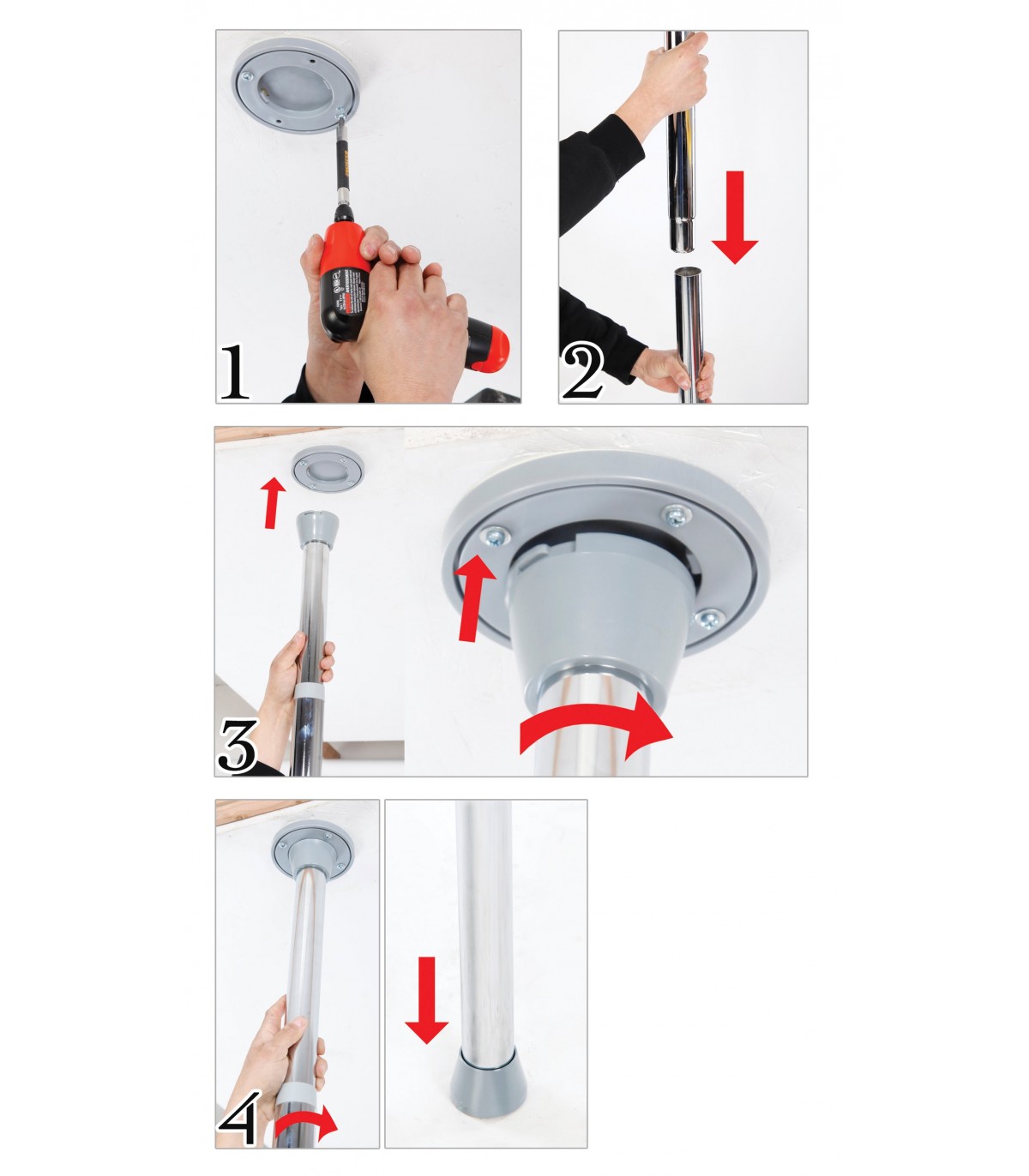 INSTRUCCIONES DE MONTAJE: El poste de acero inoxidable de alta resistencia es fácil de instalar y se ensambla en minutos. Las únicas herramientas necesarias para la instalación son una escalera, un taladro eléctrico o un destornillador y un detector de vigas. El poste de baile Fantasy fue diseñado para instalarse en prácticamente cualquier techo plano y utiliza un soporte resistente con pernos. No se recomiendan los techos abovedados, los techos acústicos ni los falsos techos. Verifique siempre la durabilidad tanto del piso como del techo antes de la instalación para garantizar la solidez y la seguridad. Si no está seguro de instalar el poste usted mismo, comuníquese con un manitas calificado para garantizar una instalación adecuada.