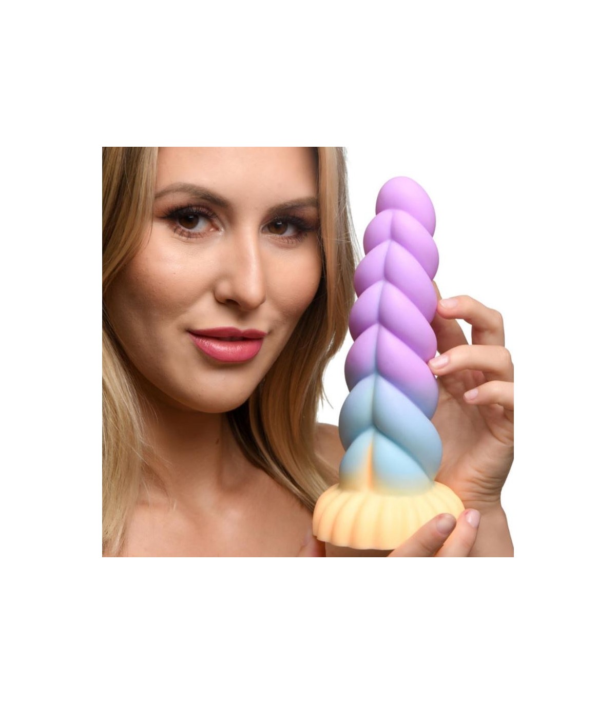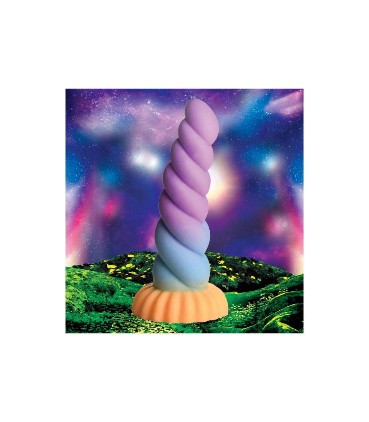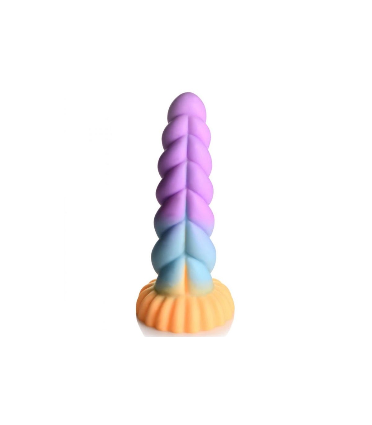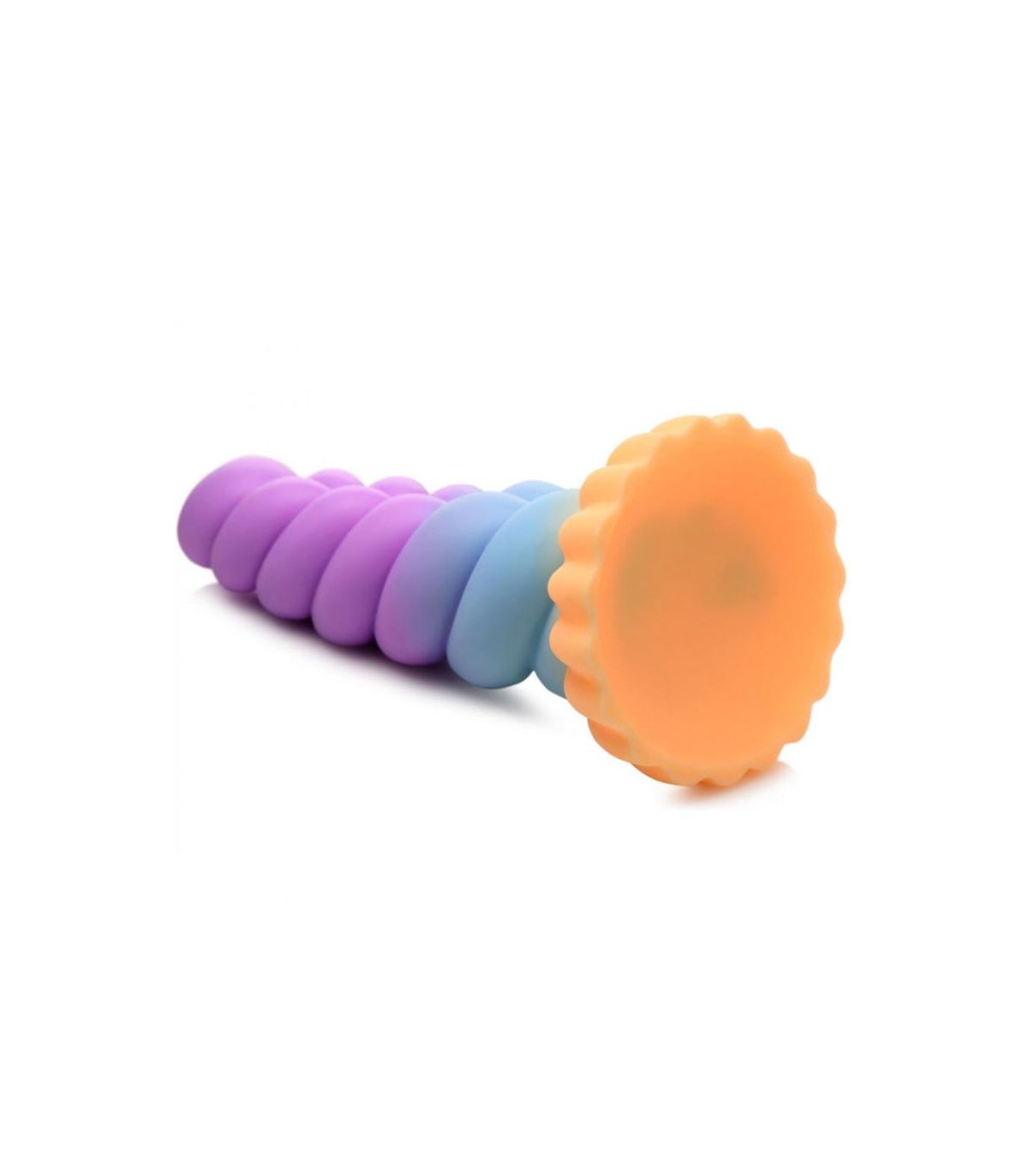 Dildo de fantasía: El cuerno retorcido tiene tonos mágicos de naranja, azul y púrpura. ¡Su diseño grueso y en espiral es perfecto para complacer tus zonas sensibles!