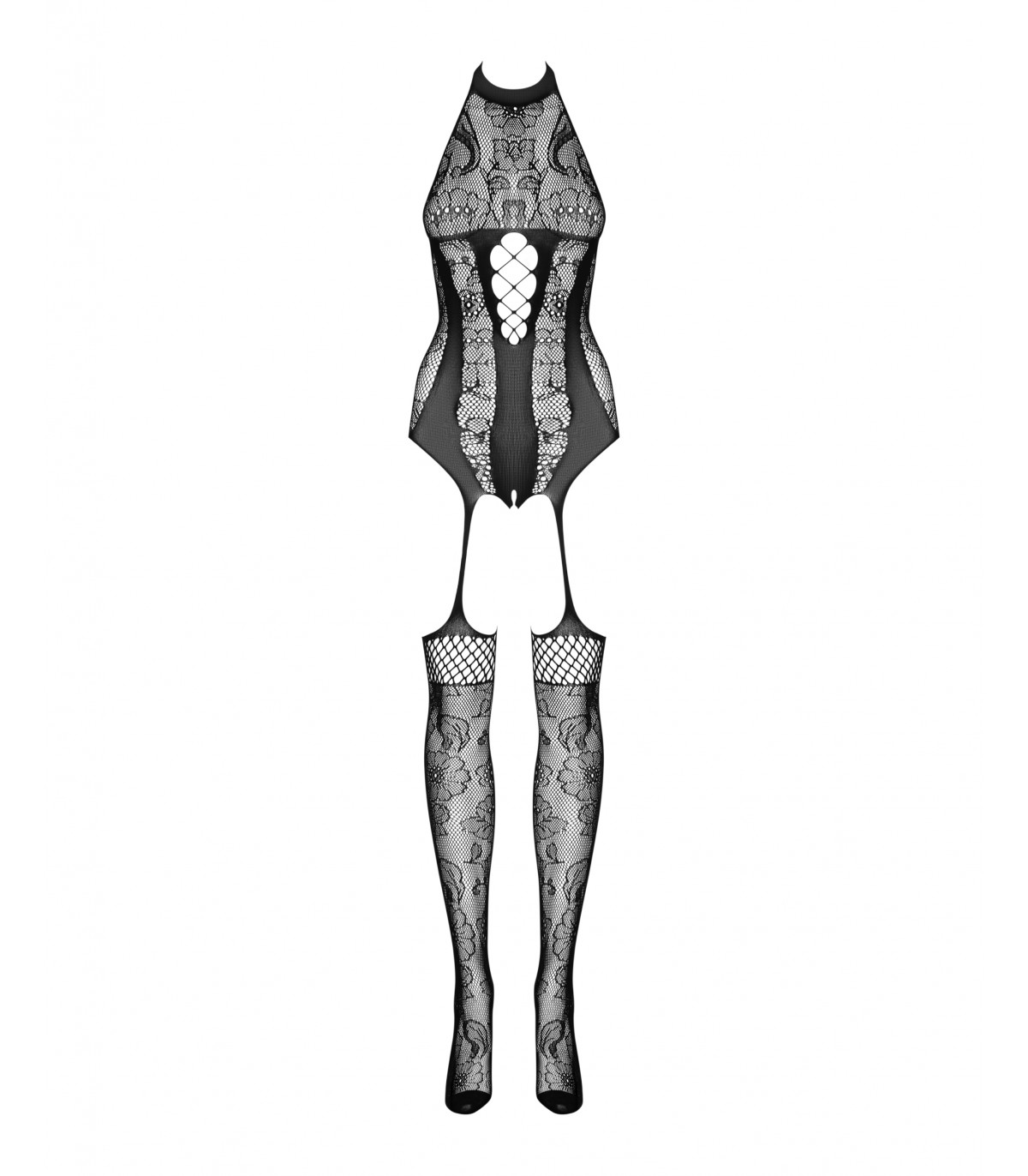 Enciende la pasión con el bodystocking F240 de diseño abierto. Esta pieza negra con estampado floral presenta una correa para el cuello y un corte decorativo debajo del busto, que se combina perfectamente con medias sexys.