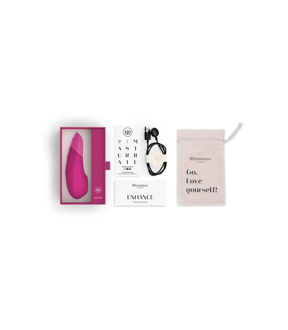 El primer producto de Womanizer que obtiene una tasa de orgasmos del 100% en las pruebas con usuarias. Con 10 niveles de intensidad Pleasure Air, 10 niveles de intensidad de vibración y 10 patrones de vibración controlables individualmente, hay más de 1000 formas de encontrar el placer con Womanizer Enhance.