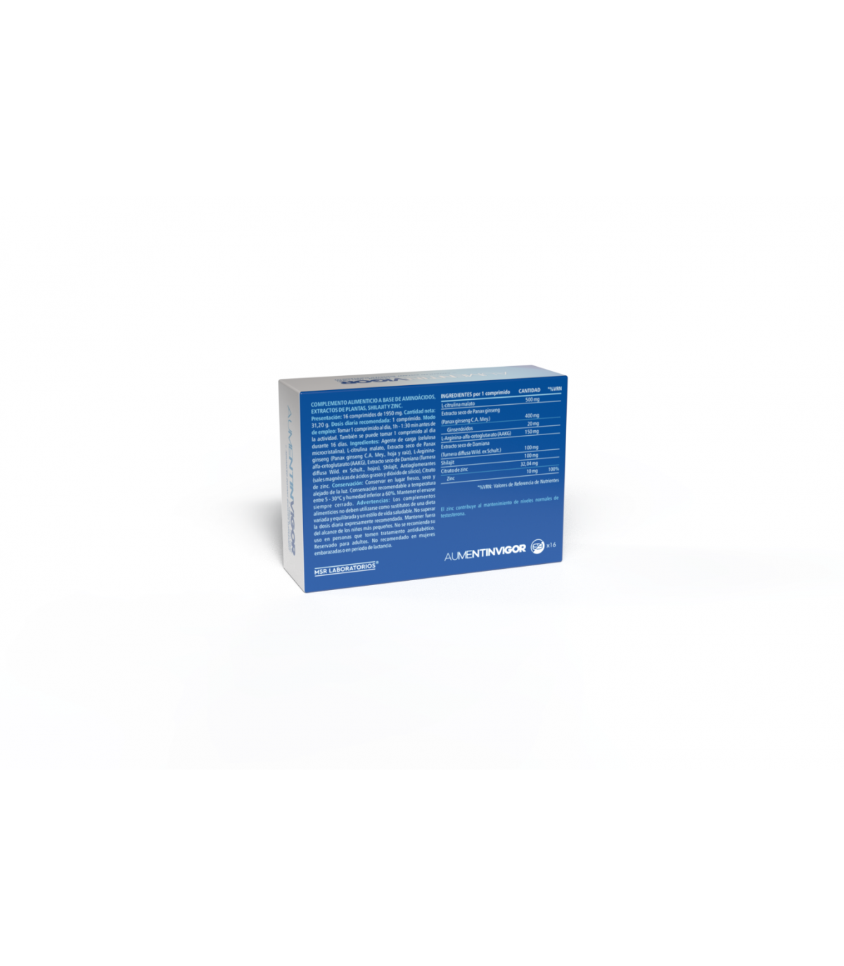 Ingredientes por 1 cápsula: Agente de carga (celulosa microcristalina), L-citrulina malato 500 mg, extracto seco de Panax ginseng (Panax ginseng C.A. Mey., 5% Ginsenósidos, hoja y raíz) 400mg de los cuales 20 mg, L-Arginina-alfa-cetoglutarato (AAKG) 150 mg, extracto seco de damiana (Turnera diffusa Wild. ex Schult., hojas) 100 mg, shilajit 100 mg, antiaglomerantes (sales magnésicas de ácidos grasos y dióxido de silicio), citrato de zinc 32,04 mg (10 mg de zinc, 100%VRN*). *VRN (Valor de Referencia de nutrientes).