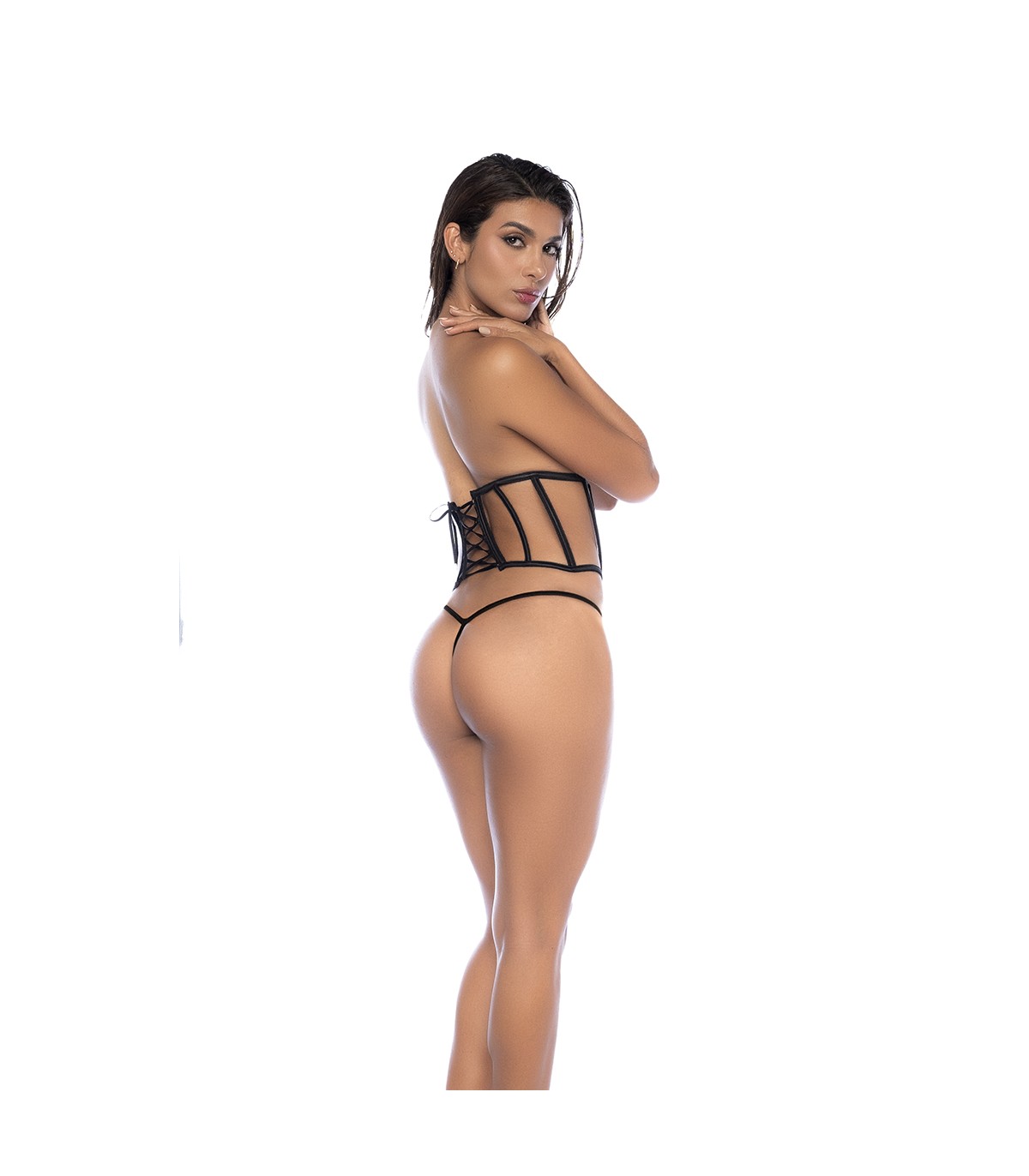 Este versátil conjunto de dos piezas incluye un corsé que realza la figura con espalda ajustable con cordones y un tanga clásico.
