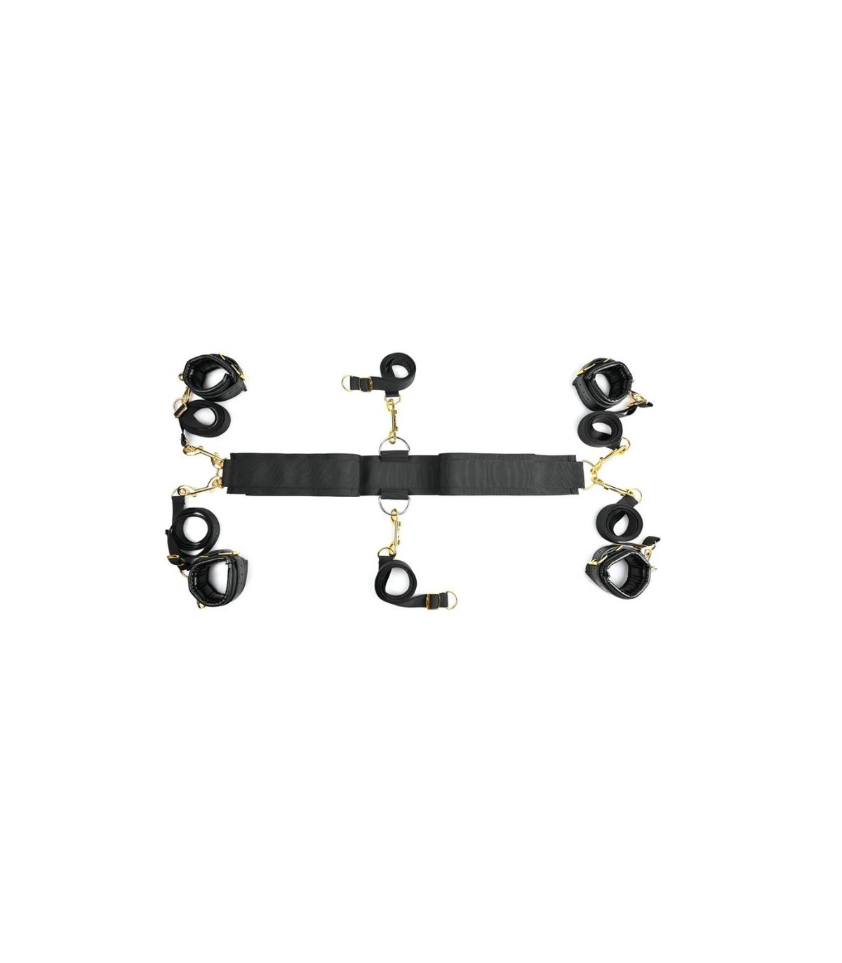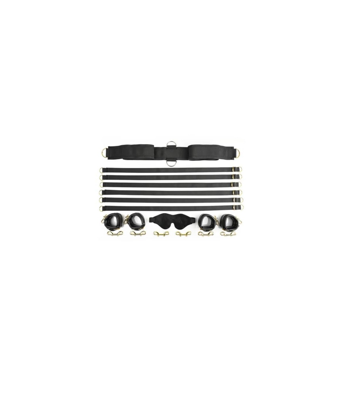 Una resistente correa de anclaje de nailon se desliza debajo del colchón para asegurar seis correas de sujeción ajustables. Cuatro correas terminan en esposas de cuero sintético de alta calidad para muñecas y tobillos con herrajes dorados, mientras que dos están confeccionadas con presillas que garantizan un apalancamiento de todo tipo. Coloca las correas alrededor del colchón a tu gusto, ata firmemente a tu pareja y coloca la suave venda de terciopelo sobre sus ojos para una sesión llena de sorpresas.