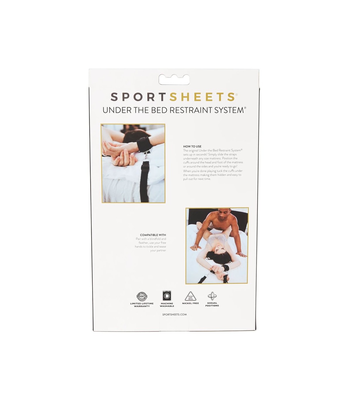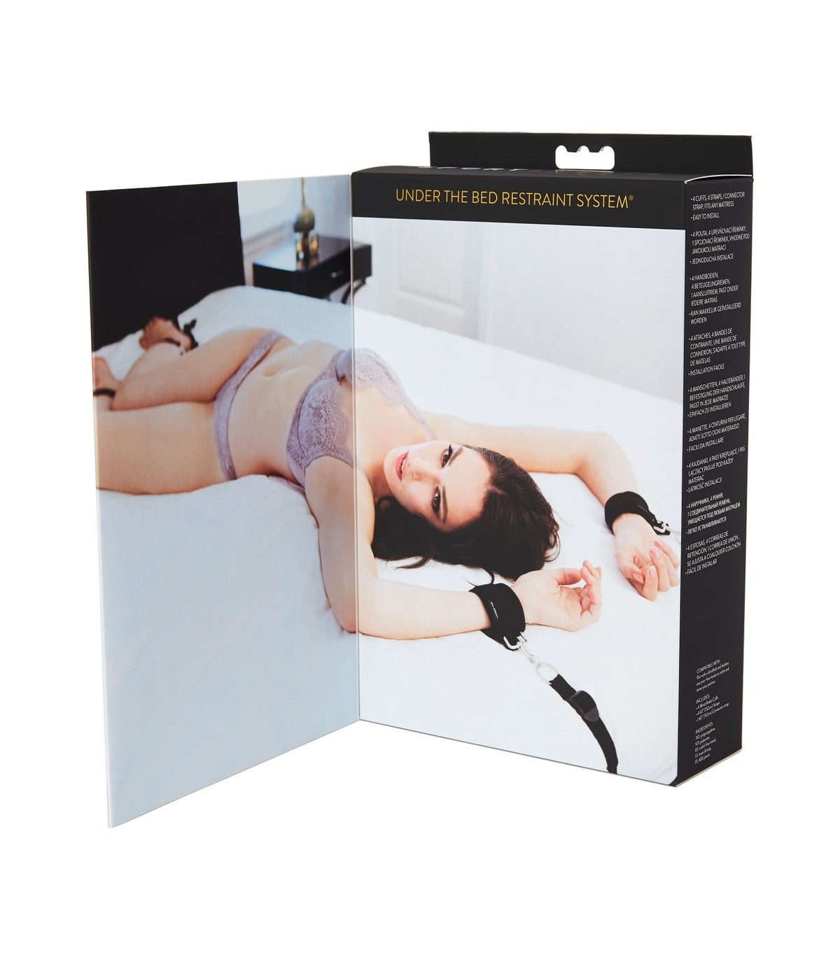 El original (sí, lo inventamos) sistema de sujeción Under The Bed® es fácil de instalar; de hecho, se instala en minutos. 4 esposas ajustables (para muñecas de 10 a 30 cm), cuatro correas de sujeción fijadas a una correa conectora que se ajusta firmemente debajo del colchón. Sujete los brazos y piernas de su pareja desde los lados o la base de la cama. La correa de sujeción se instala rápidamente debajo de cualquier colchón sin ganchos y se ajusta al tamaño deseado. Fácil de instalar en cualquier colchón. Portátil e ideal para una escapada sorpresa.