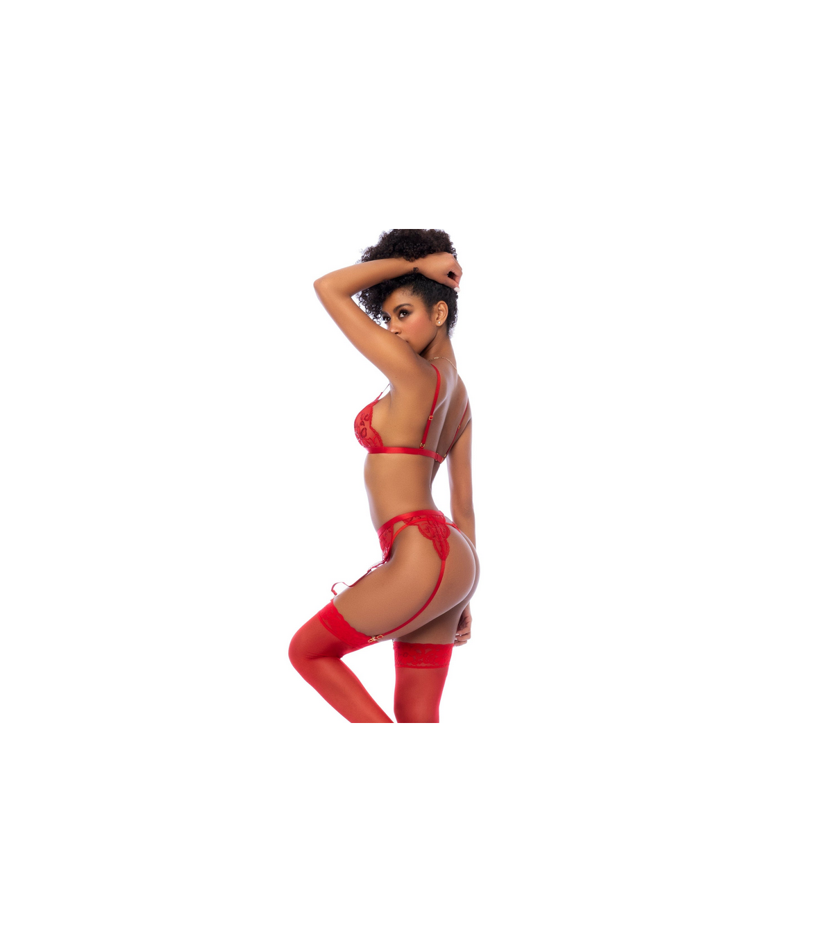 El conjunto de tres piezas incluye bralette con tirantes ajustables, liguero y tanga a juego. No incluye medias.