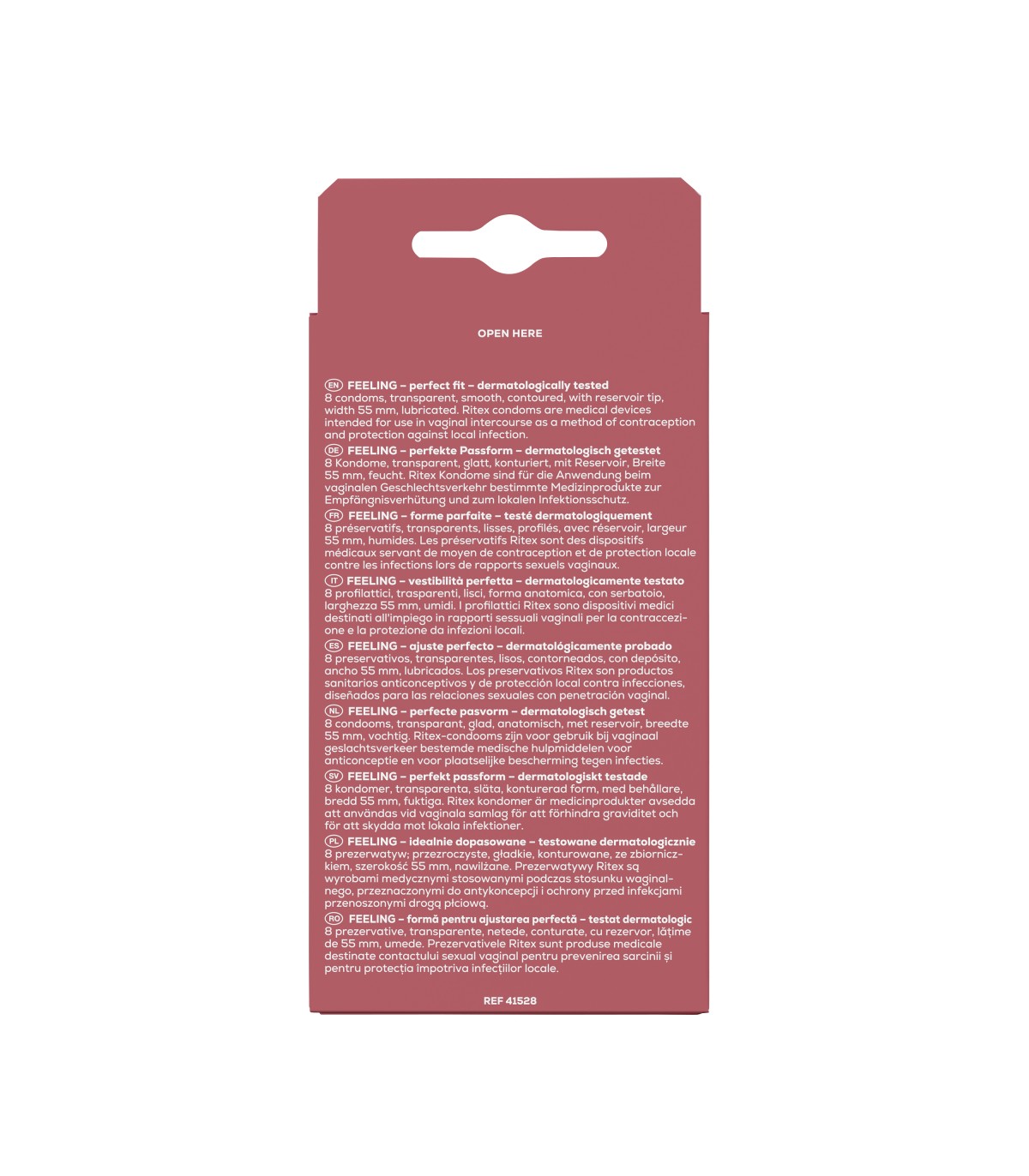 Los preservativos FEELING, con su extraordinaria forma Ritex Perfect Form®, se ajustan perfectamente a cada centímetro para un placer sexual intenso y prolongado. La forma Ritex Perfect Form® permite una estimulación suave y sedosa. El gel lubricante húmedo garantiza una experiencia sexual suave.