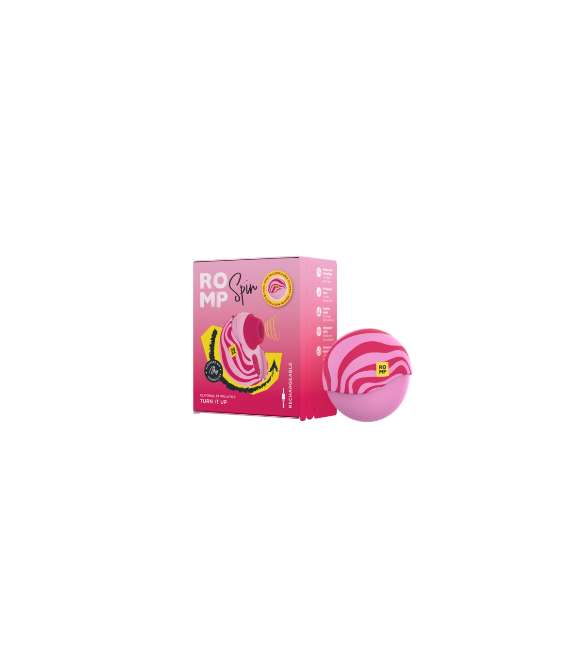 • Pleasure Air Perfection: Succión de aire única para el clítoris de ROMP con 10 intensidades sensuales, desde excitante hasta lo más extremo.