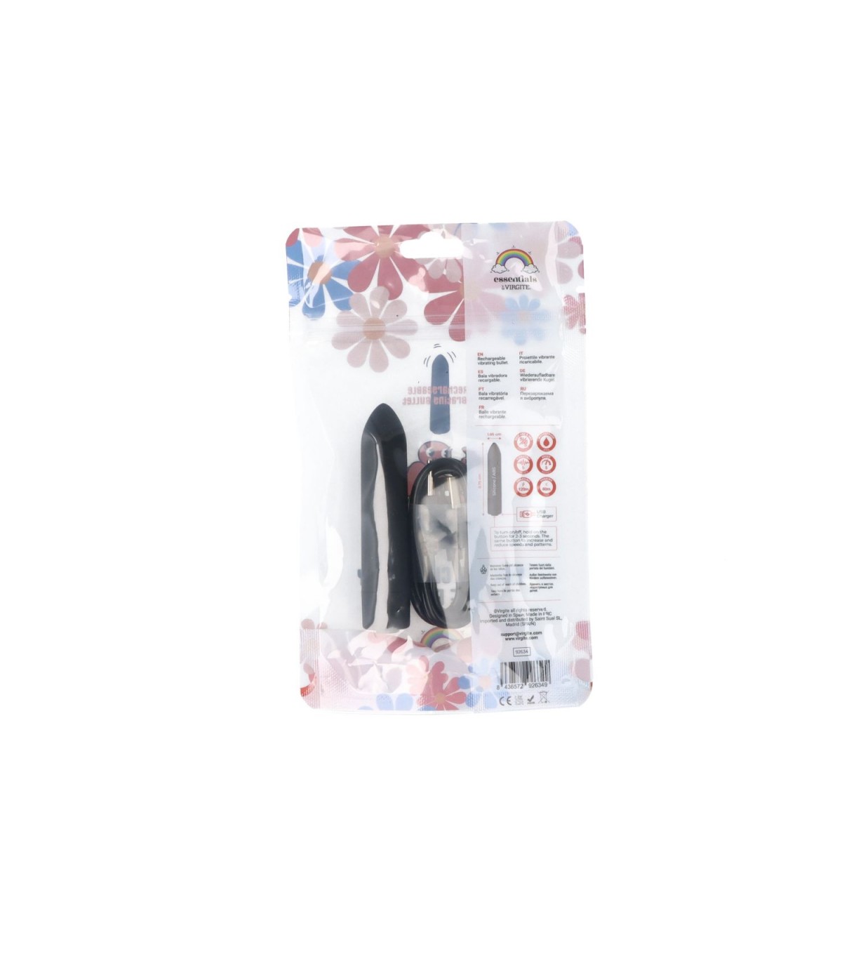Bala vibradora recargable mediante cable USB con diferentes velocidades e intensidades presentada en bolsa decorada.