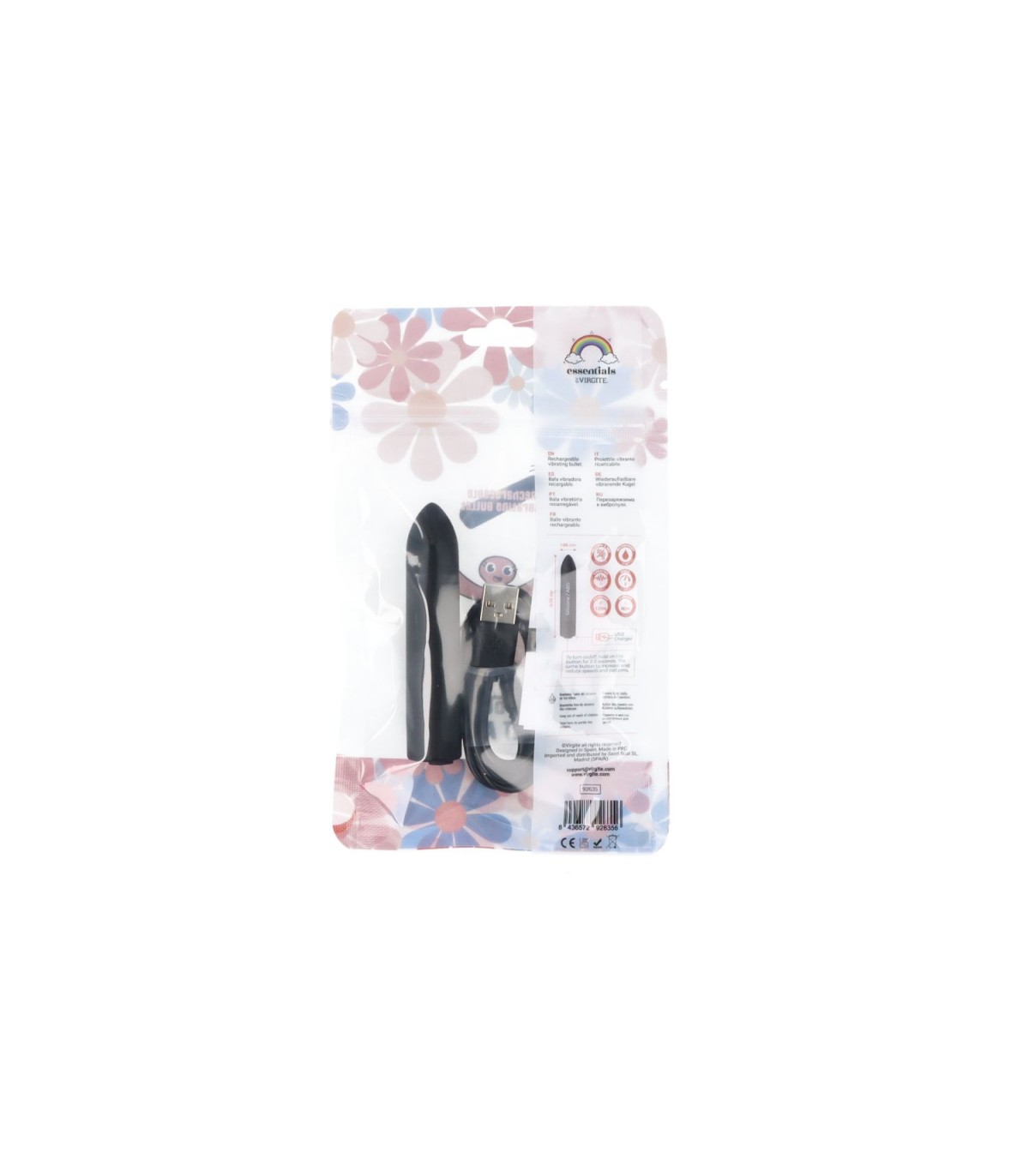 Bala vibradora recargable mediante cable USB con diferentes velocidades e intensidades presentada en bolsa decorada.