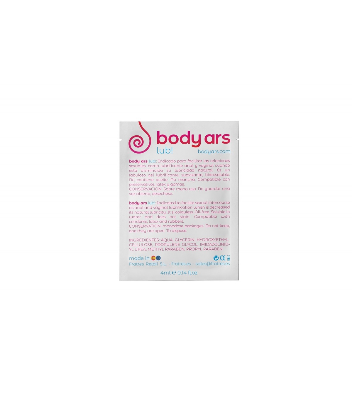 El gel lubricante Body ars es hidrosoluble y está formulado a base de polímeros celulósicos, en una base acuosa y glicerina. No tiene olor, ni sabor.