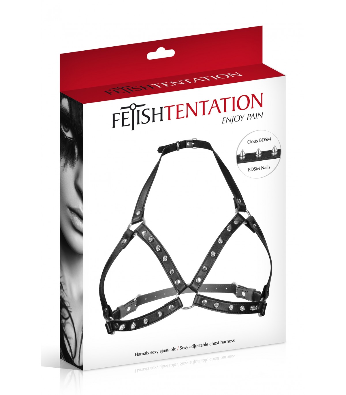 Arnés para mujer totalmente ajustable. Simula piel. Lleva pinchos a lo largo del arnés.