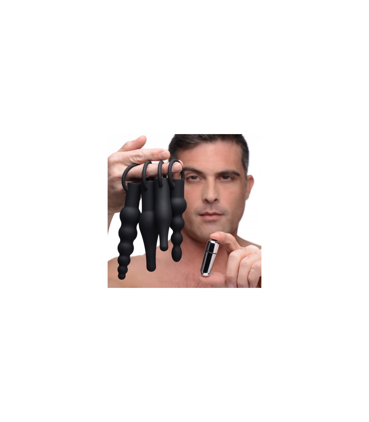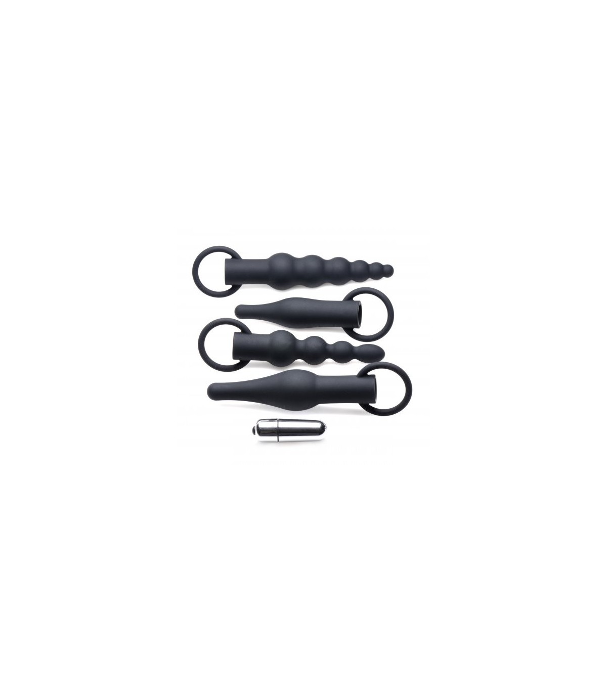 Kit de tiras anales de diferentes tamaños realizados en silicona. Incluye una bala vibradora con 3 velocidades para insertarla en cada una de las tiras anales.