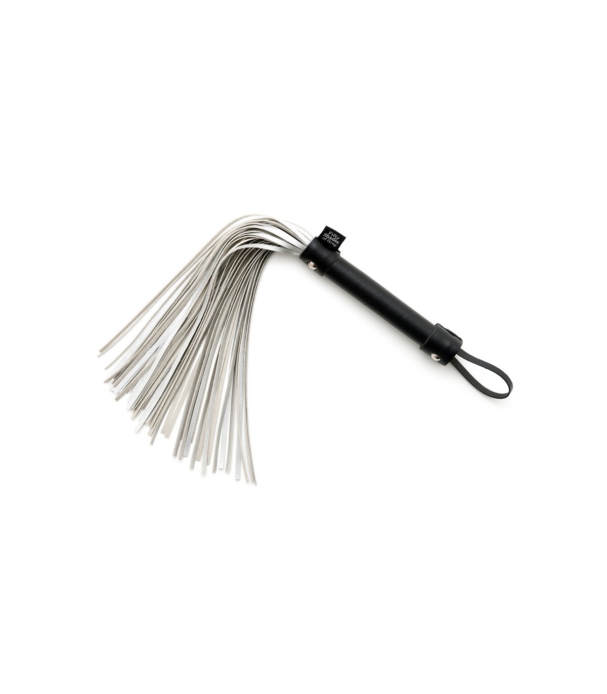 Una visión en negro y metal plateado, este flogger de cuero de imitación destaca entre los accesorios tradicionales de bondage como un instrumento exquisito del sadismo.