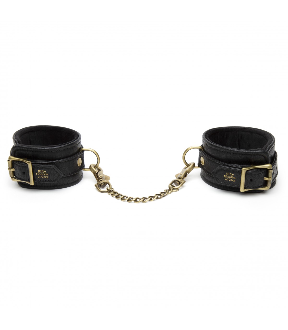Crea tu propia escena de Cincuenta sombras con estas esposas para tobillos sumamente cómodas gracias al relleno y forro aterciopelado. El cuero de imitación y el efecto oro envejecido darán un toque lujoso a tus juegos inspirados en Ana y Christian.
