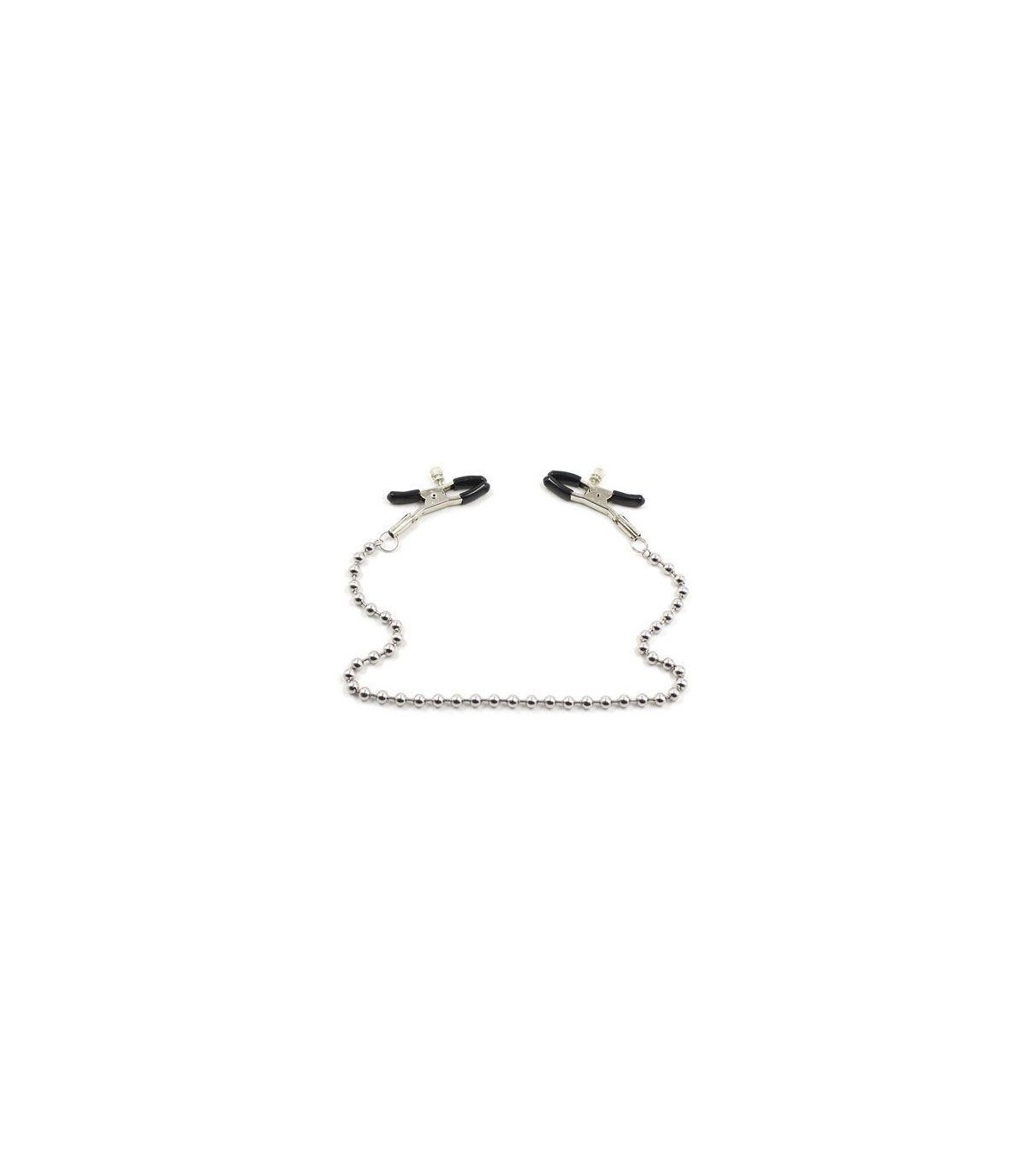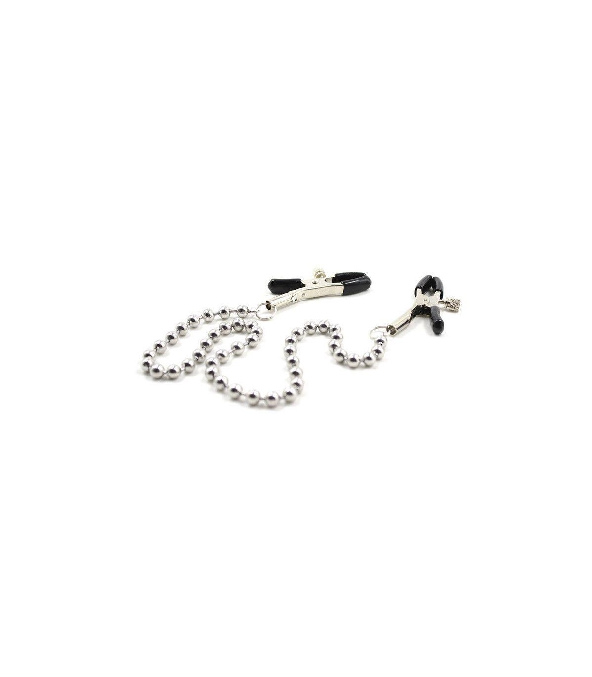 Pinzas para pezones con presión regulable unidas por cadena metálica. Para entusiastas del BDSM pero también para principiantes que deseen añadir una cantidad extra de pasión y excitación a la relación sexual.